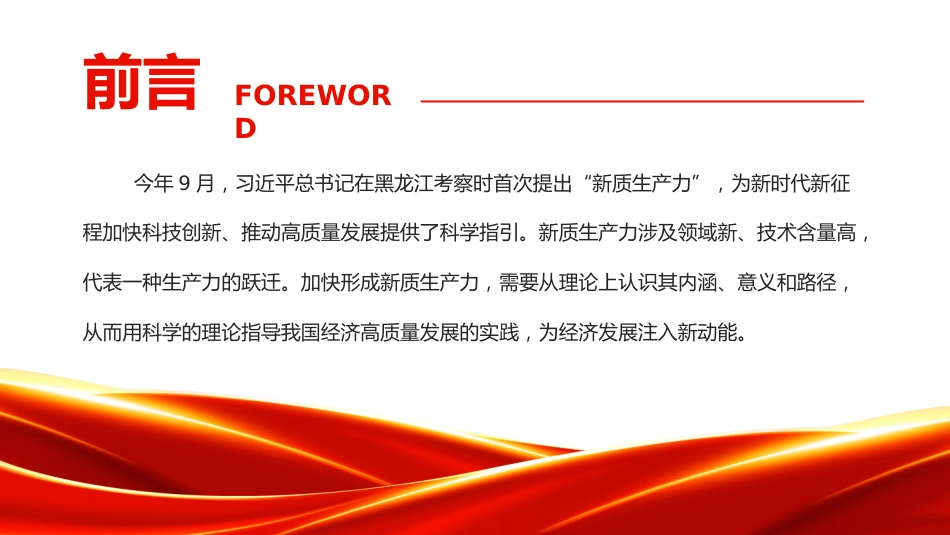 以新質(zhì)生產(chǎn)力打造發(fā)展新優(yōu)勢演講人:某某黨支部2023年黨員干部學(xué)習(xí)教育專題黨課前言FOREWORD今年9月,習(xí)近平總書記在黑龍江考察時首次提出“新質(zhì)生產(chǎn)力”,為新時代新征程加快科技創(chuàng)新、推動高質(zhì)量發(fā)展提供了科學(xué)指引。新質(zhì)生產(chǎn)力涉及領(lǐng)域新、技術(shù)含量高,代表一種生產(chǎn)力的躍遷。加快形成新質(zhì)生產(chǎn)力,需要從理論上認識其內(nèi)涵、意義和路徑,從而用科學(xué)的理論指導(dǎo)我國經(jīng)濟高質(zhì)量發(fā)展的實踐,為經(jīng)濟發(fā)展注入新動能。目錄第一深入理解科學(xué)內(nèi)涵第二充分認識重要意義第三切實找準形成路徑第一部分深入理解科學(xué)內(nèi)涵深入理解科學(xué)內(nèi)涵長期以來,人們把生產(chǎn)力定義為人類征服和改造...