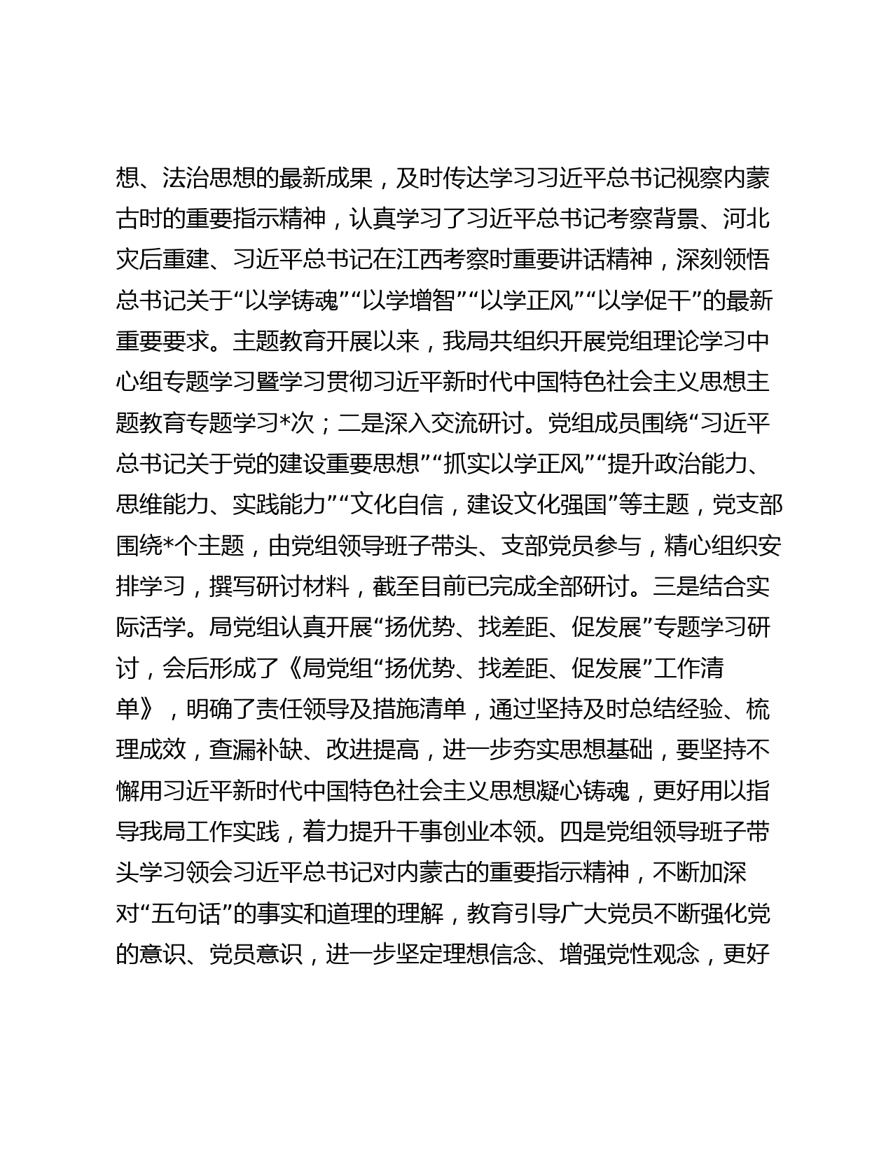 局黨組主題教育工作總結(jié)局堅持以習(xí)近平新時代中國特色社會主義思想為指導(dǎo),認(rèn)真學(xué)習(xí)習(xí)近平總書記關(guān)于主題教育系列重要講話和重要指示批示精神,按照縣委主題教育領(lǐng)導(dǎo)小組統(tǒng)一安排,牢牢把握“學(xué)思想、強(qiáng)黨性、重...
