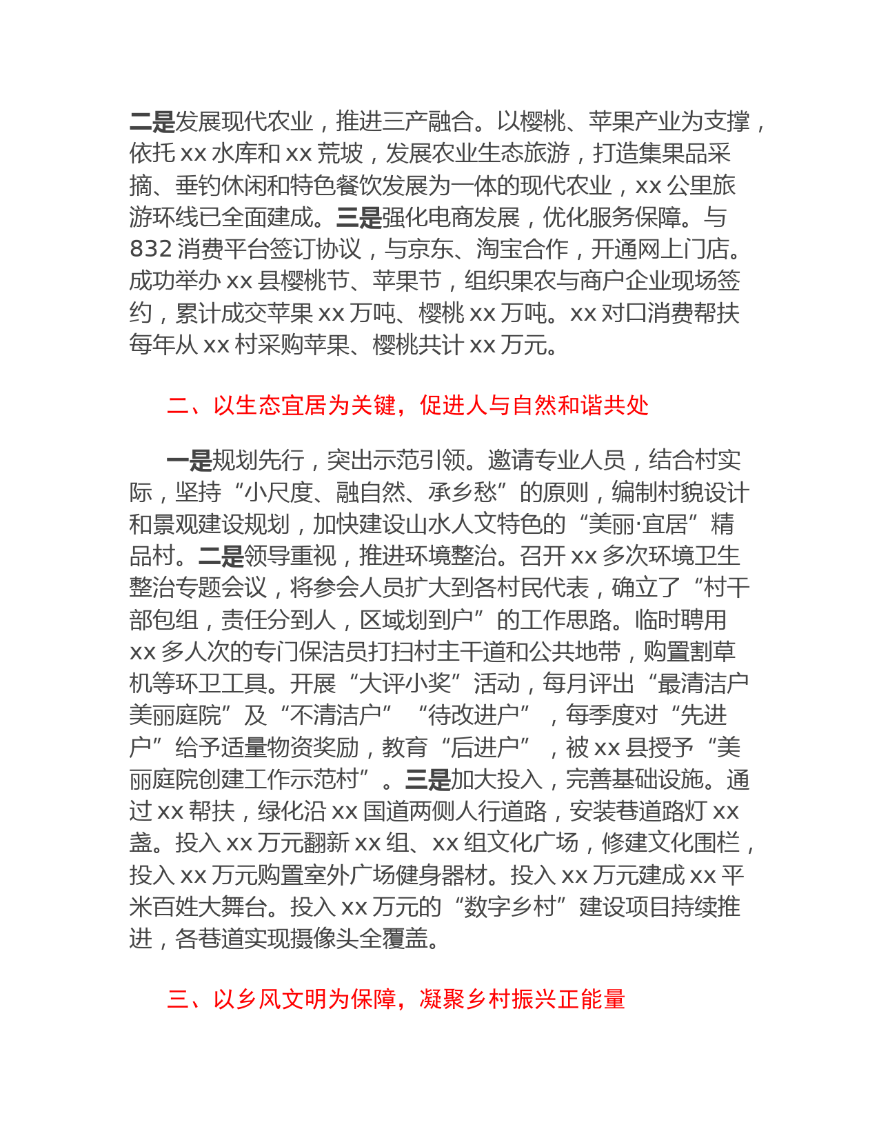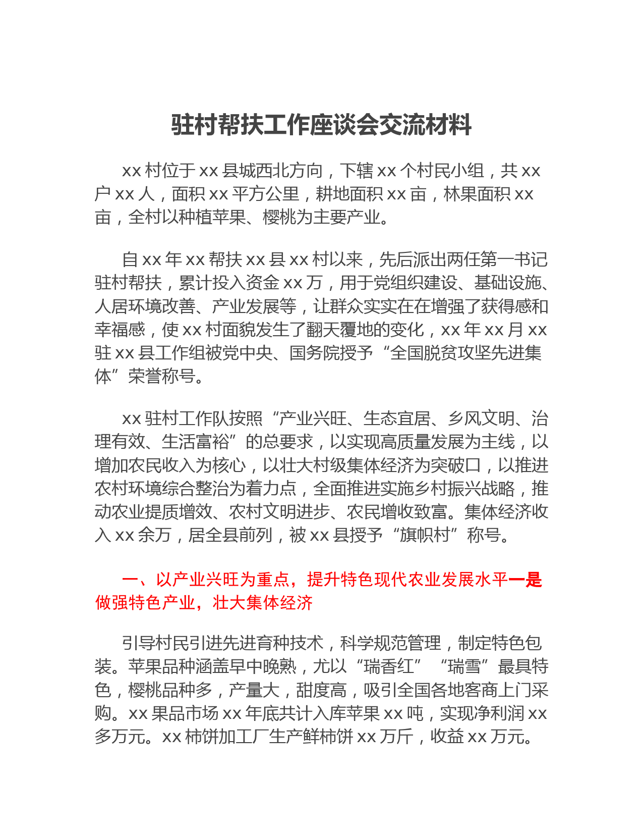 駐村幫扶工作座談會交流材料xx村位于xx縣城西北方向,下轄xx個村民小組,共xx戶xx人,面積xx平方公里,耕地面積xx畝,林果面積xx畝,全村以種植蘋果、櫻桃為主要產(chǎn)業(yè)。自xx年xx幫扶xx縣xx村以來,先后派出兩任第...