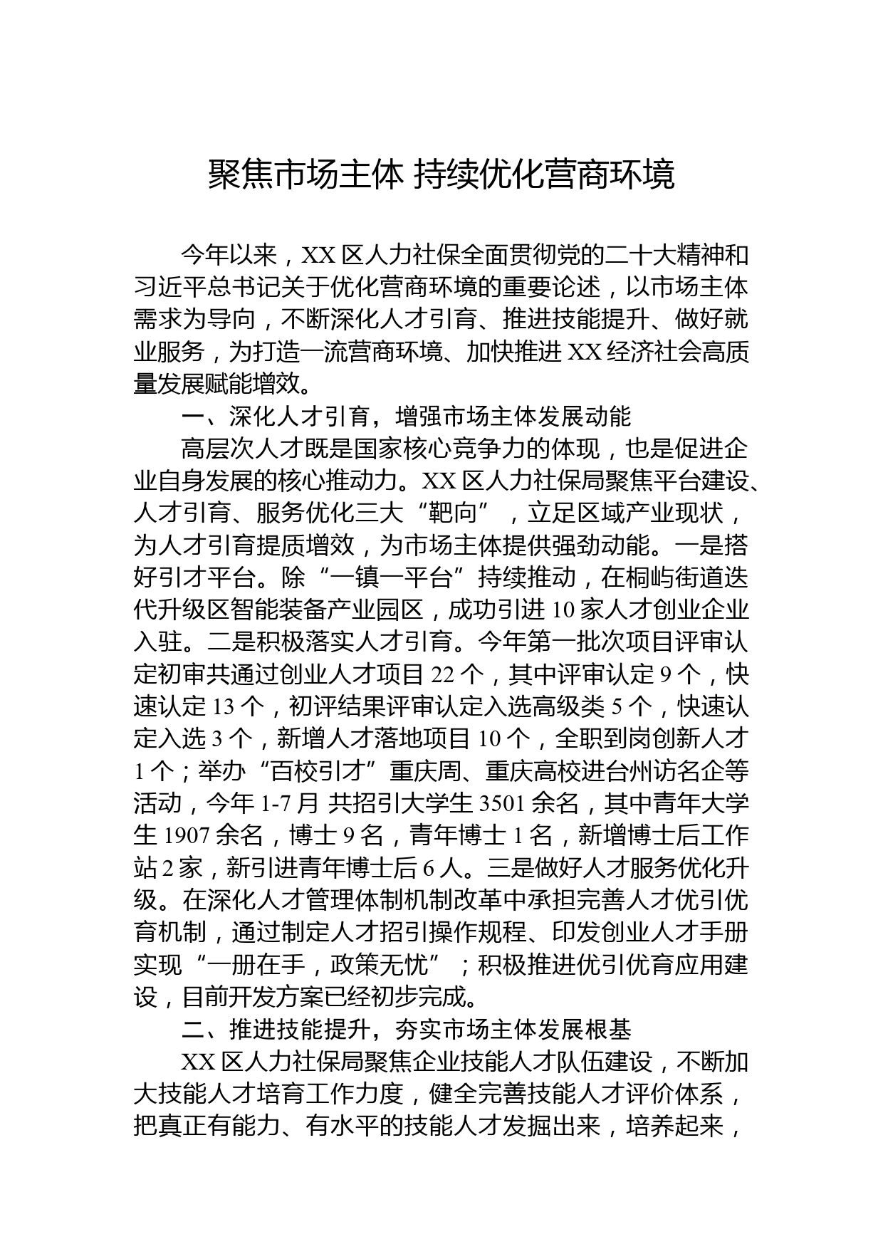 聚焦市場主體持續(xù)優(yōu)化營商環(huán)境今年以來,XX區(qū)人力社保全面貫徹黨的二十大精神和習近平總書記關于優(yōu)化營商環(huán)境的重要論述,以市場主體需求為導向,不斷深化人才引育、推進技能提升、做好就業(yè)服務,為打造一流營商...