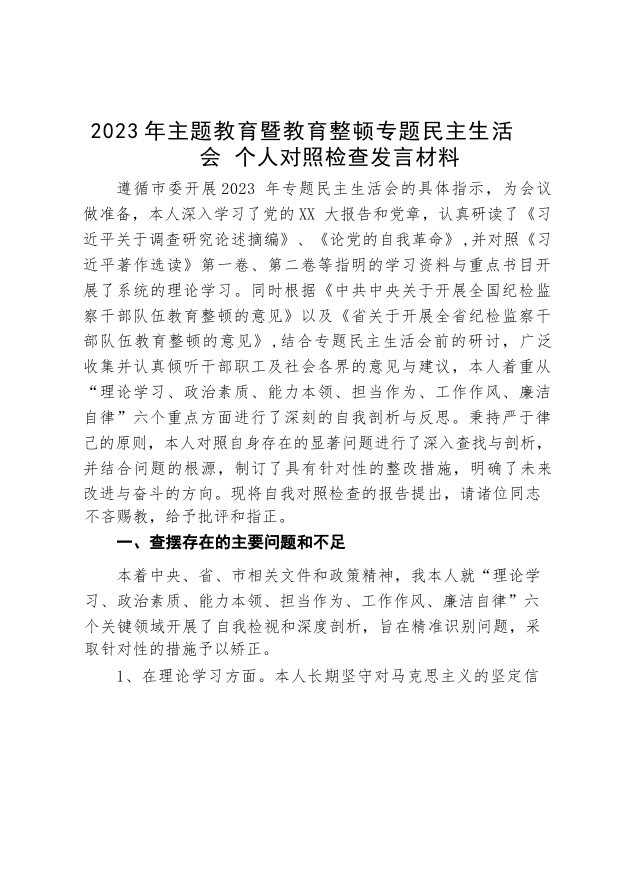 2023年主題教育暨教育整頓專題民主生活會個(gè)人對照檢查發(fā)言材料遵循市委開展2023年專題民主生活會的具體指示,為會議做準(zhǔn)備,本人深入學(xué)習(xí)了黨的XX大報(bào)告和黨章,認(rèn)真研讀了《習(xí)近平關(guān)于調(diào)查研究論述摘編》、《論...