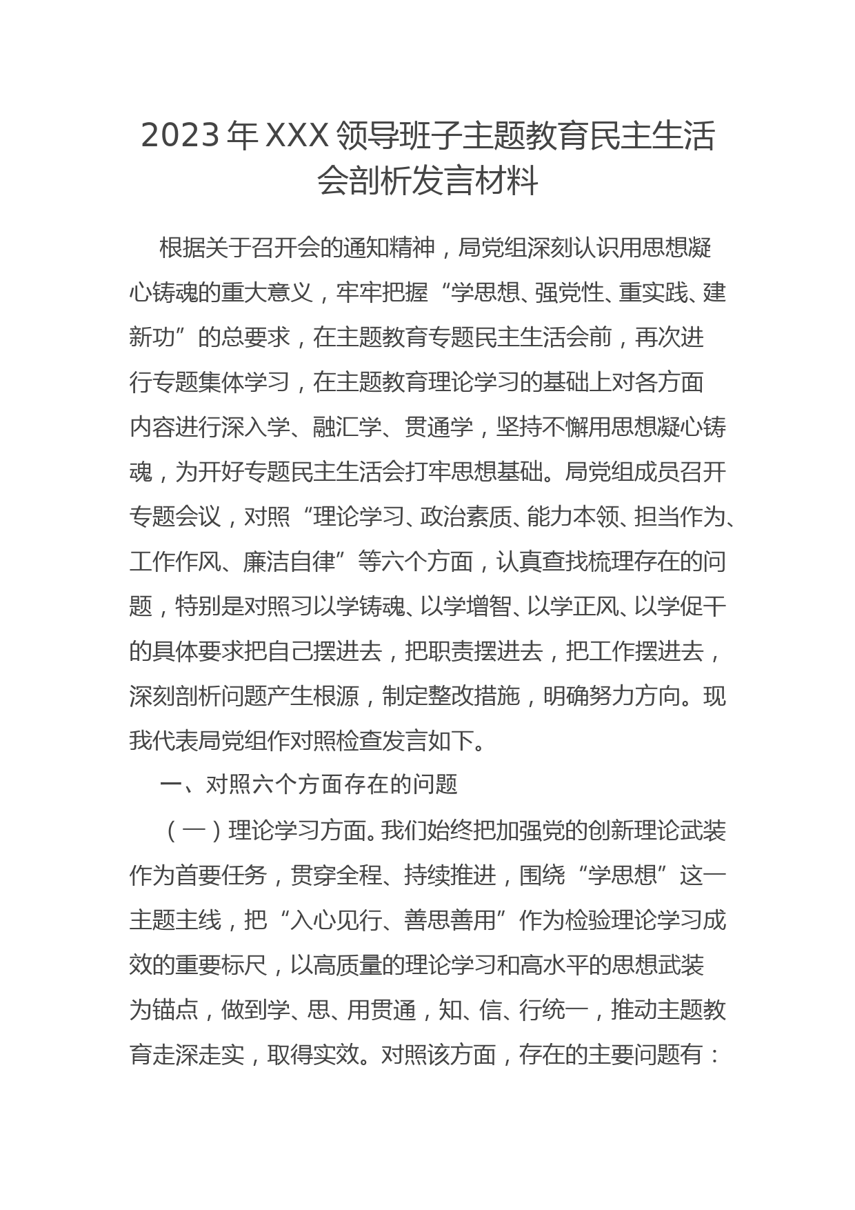 2023年XXX領(lǐng)導(dǎo)班子主題教育民主生活會剖析發(fā)言材料VIP免費