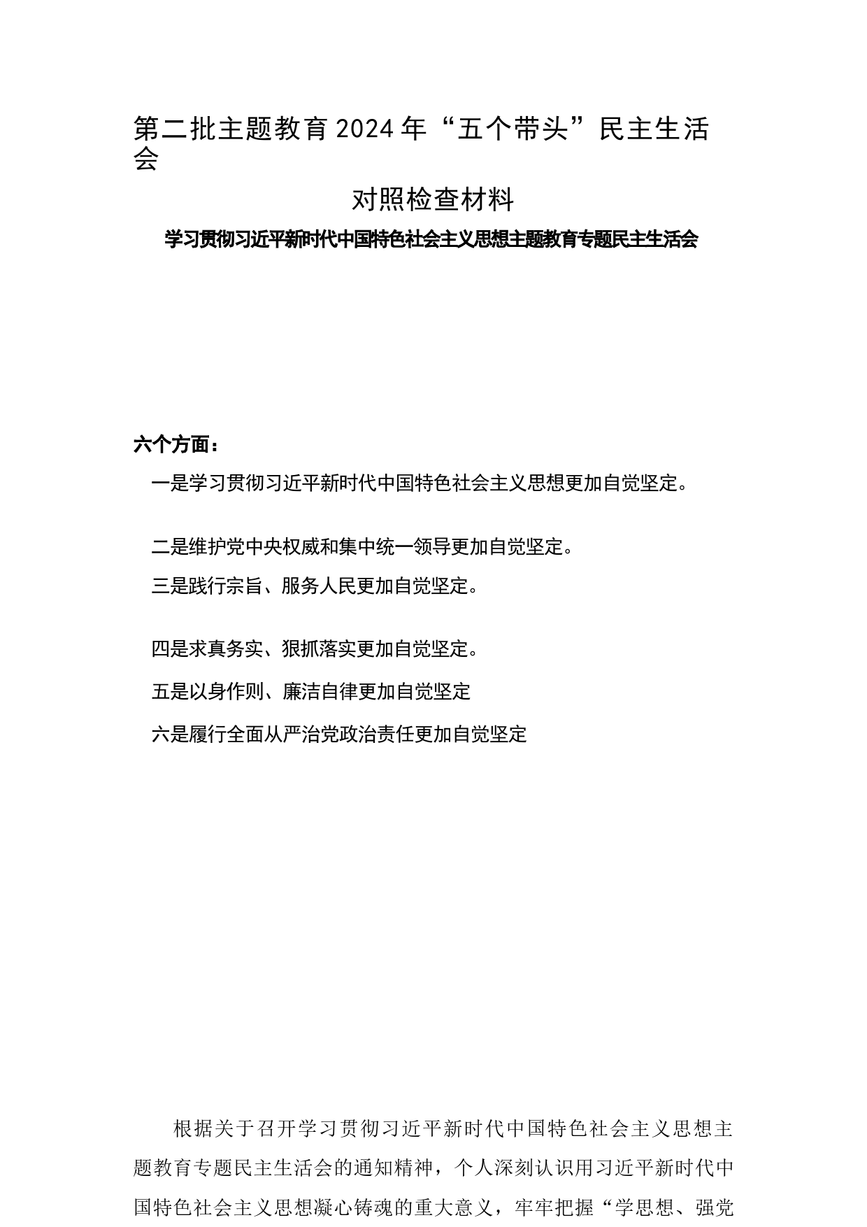 第二批主題教育2024年“五個(gè)帶頭”民主生活會(huì)對(duì)照檢查材料學(xué)習(xí)貫徹習(xí)近平新時(shí)代中國(guó)特色社會(huì)主義思想主題教育專題民主生活會(huì)六個(gè)方面:一是學(xué)習(xí)貫徹習(xí)近平新時(shí)代中國(guó)特色社會(huì)主義思想更加自覺堅(jiān)定。二是維護(hù)黨中...