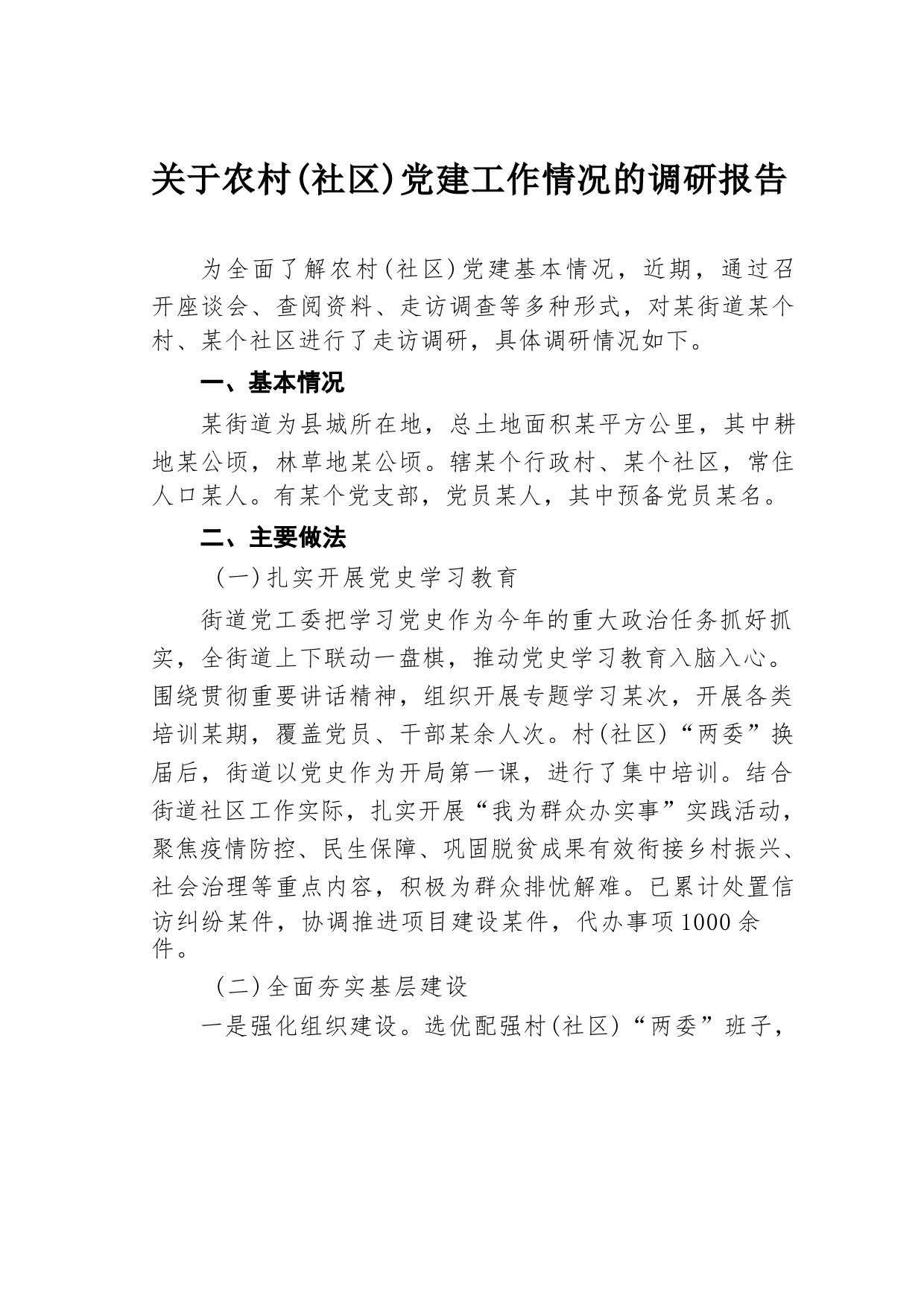 關(guān)于農(nóng)村(社區(qū))黨建工作情況的調(diào)研報告為全面了解農(nóng)村(社區(qū))黨建基本情況,近期,通過召開座談會、查閱資料、走訪調(diào)查等多種形式,對某街道某個村、某個社區(qū)進(jìn)行了走訪調(diào)研,具體調(diào)研情況如下。一、基本情況某街...