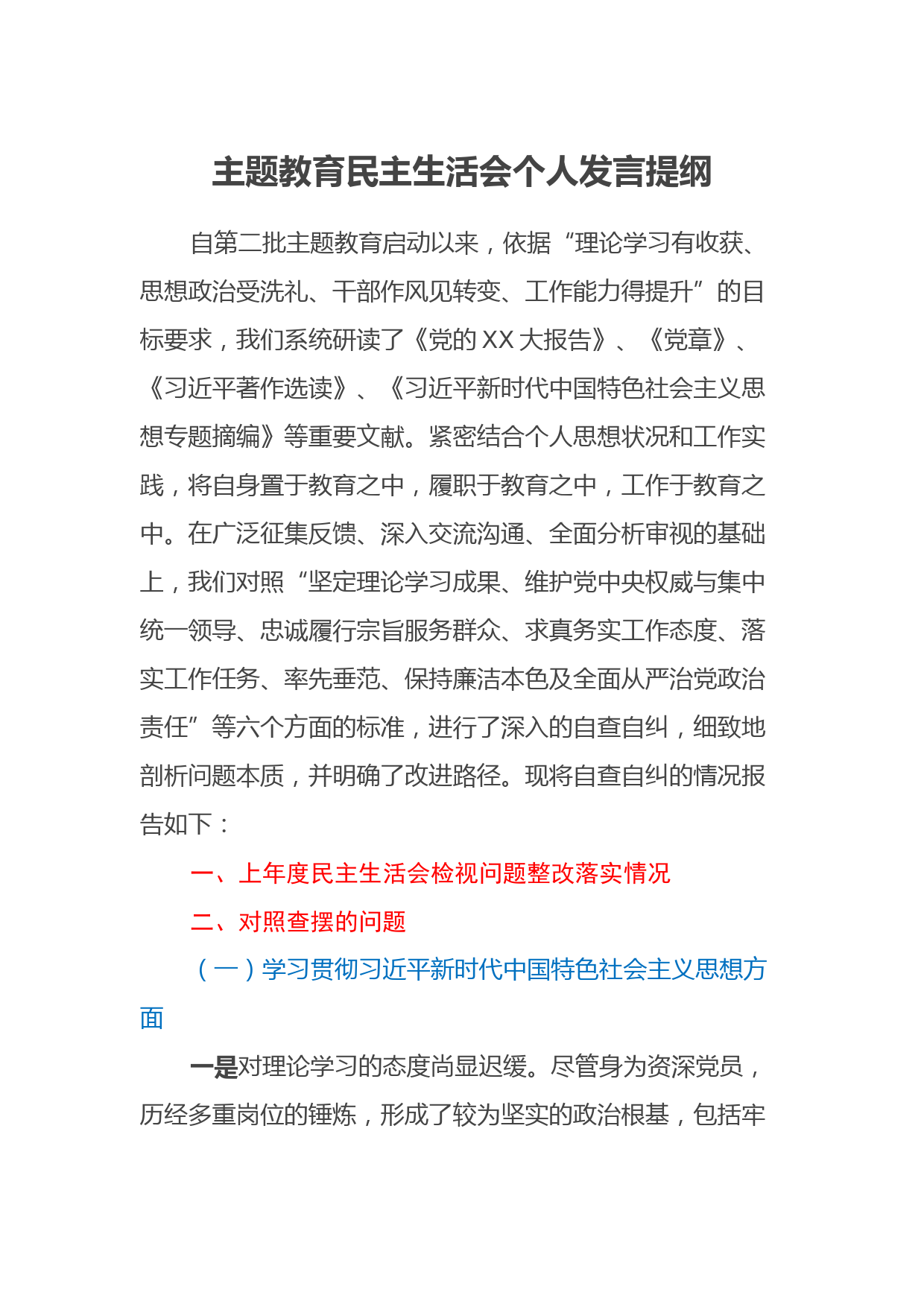 主題教育民主生活會個人發(fā)言提綱自第二批主題教育啟動以來,依據(jù)“理論學(xué)習(xí)有收獲、思想政治受洗禮、干部作風(fēng)見轉(zhuǎn)變、工作能力得提升”的目標(biāo)要求,我們系統(tǒng)研讀了《黨的XX大報告》、《黨章》、《習(xí)近平著作選讀》、《習(xí)近平新時代中國特色社會主義思想專題摘編》等重要文獻(xiàn)。緊密結(jié)合個人思想狀況和工作實踐,將自身置于教育之中,履職于教育之中,工作于教育之中。在廣泛征集反饋、深入交流溝通、全面分析審視的基礎(chǔ)上,我們對照“堅定理論學(xué)習(xí)成果、維護(hù)黨中央權(quán)威與集中統(tǒng)一領(lǐng)導(dǎo)、忠誠履行宗旨服務(wù)群眾、求真務(wù)實工作態(tài)度、落實工作任務(wù)、率先垂范、保持廉潔本色及全...