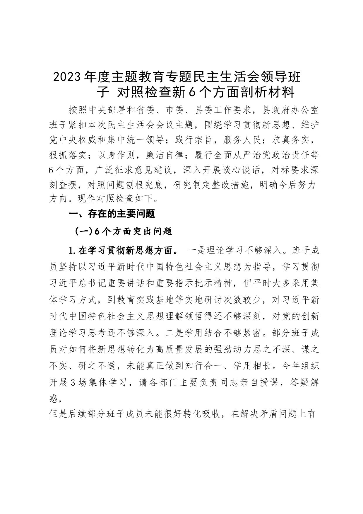 2023年度主題教育專題民主生活會領(lǐng)導(dǎo)班子對照檢查新6個(gè)方面剖析材料按照中央部署和省委、市委、縣委工作要求,縣政府辦公室班子緊扣本次民主生活會會議主題,圍繞學(xué)習(xí)貫徹新思想、維護(hù)黨中央權(quán)威和集中統(tǒng)一領(lǐng)導(dǎo);踐行宗旨,服務(wù)人民;求真務(wù)實(shí),狠抓落實(shí);以身作則,廉潔自律;履行全面從嚴(yán)治黨政治責(zé)任等6個(gè)方面,廣泛征求意見建議,深入開展談心談話,對標(biāo)要求深刻查擺,對照問題刨根究底,研究制定整改措施,明確今后努力方向。現(xiàn)作對照檢查如下。一、存在的主要問題(一)6個(gè)方面突出問題1.在學(xué)習(xí)貫徹新思想方面。一是理論學(xué)習(xí)不夠深入。班子成員堅(jiān)持以習(xí)近平新時(shí)代中...