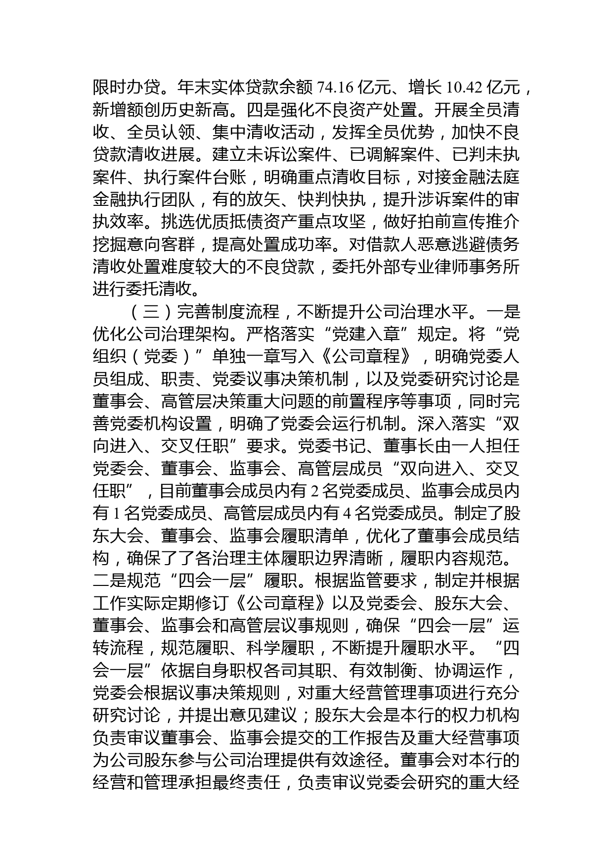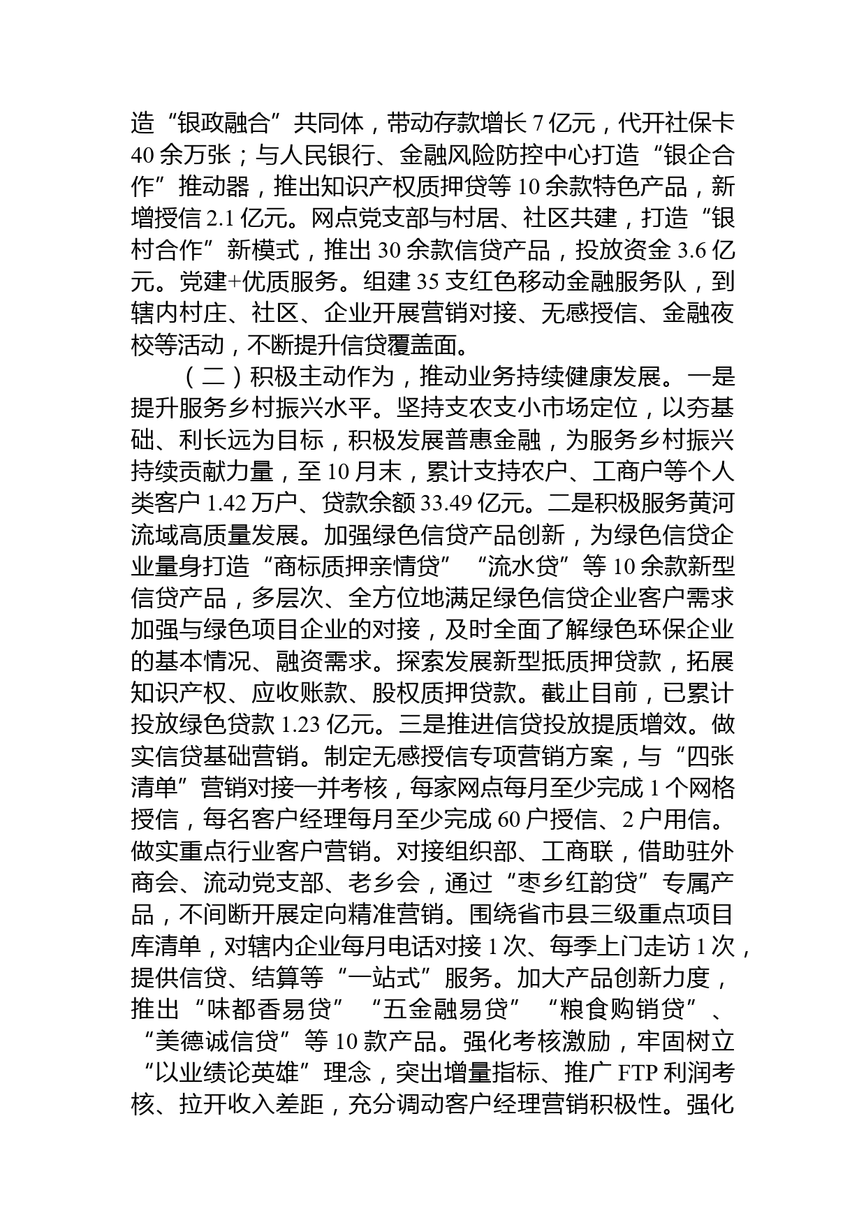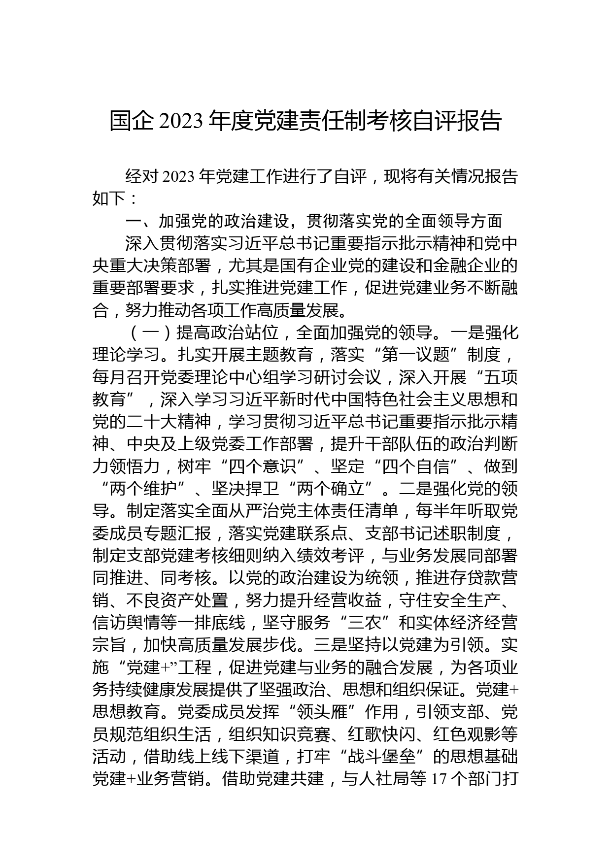 國企2023年度黨建責(zé)任制考核自評報告經(jīng)對2023年黨建工作進(jìn)行了自評,現(xiàn)將有關(guān)情況報告如下:一、加強(qiáng)黨的政治建設(shè),貫徹落實黨的全面領(lǐng)導(dǎo)方面深入貫徹落實習(xí)近平總書記重要指示批示精神和黨中央重大決策部署,尤其是國有企業(yè)黨的建設(shè)和金融企業(yè)的重要部署要求,扎實推進(jìn)黨建工作,促進(jìn)黨建業(yè)務(wù)不斷融合,努力推動各項工作高質(zhì)量發(fā)展。(一)提高政治站位,全面加強(qiáng)黨的領(lǐng)導(dǎo)。一是強(qiáng)化理論學(xué)習(xí)。扎實開展主題教育,落實“第一議題”制度,每月召開黨委理論中心組學(xué)習(xí)研討會議,深入開展“五項教育”,深入學(xué)習(xí)習(xí)近平新時代中國特色社會主義思想和黨的二十大精神,學(xué)習(xí)貫徹...