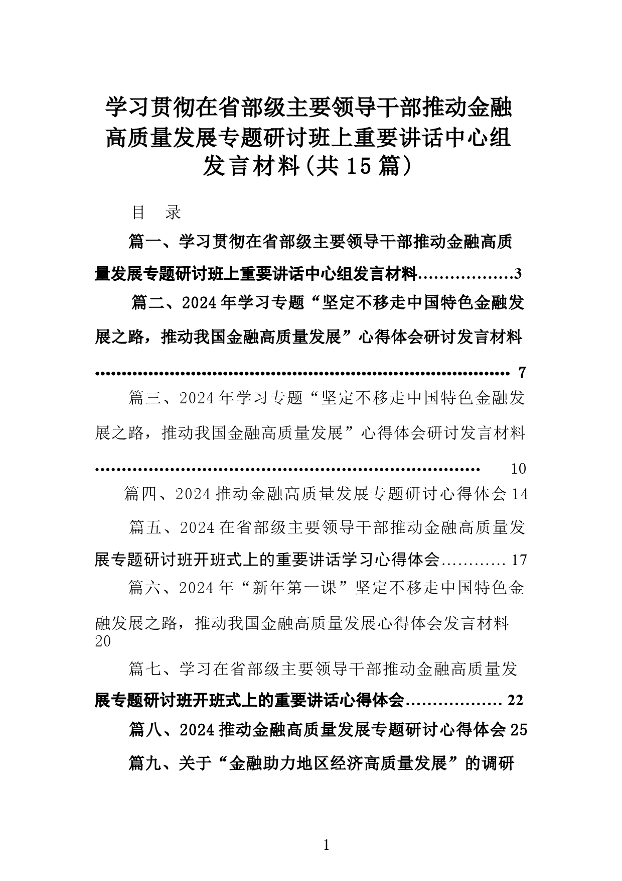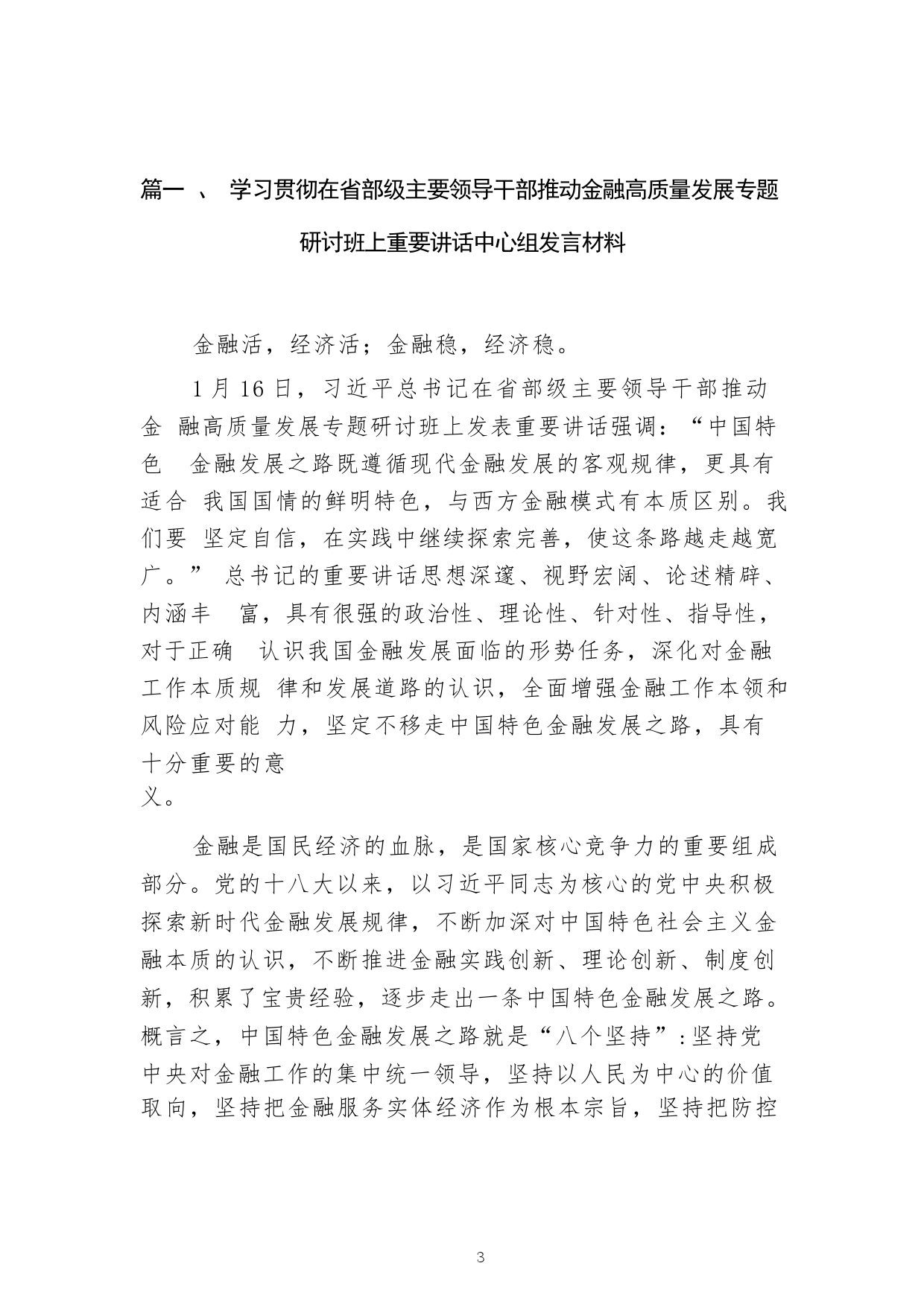 學(xué)習(xí)貫徹在省部級主要領(lǐng)導(dǎo)干部推動金融高質(zhì)量發(fā)展專題研討班上重要講話中心組發(fā)言材料(共15篇)目錄篇一、學(xué)習(xí)貫徹在省部級主要領(lǐng)導(dǎo)干部推動金融高質(zhì)量發(fā)展專題研討班上重要講話中心組發(fā)言材料………………3篇二、2024年學(xué)習(xí)專題“堅定不移走中國特色金融發(fā)展之路,推動我國金融高質(zhì)量發(fā)展”心得體會研討發(fā)言材料……………………………………………………………………7篇三、2024年學(xué)習(xí)專題“堅定不移走中國特色金融發(fā)展之路,推動我國金融高質(zhì)量發(fā)展”心得體會研討發(fā)言材料………………………………………………………………10篇四、2024推動金融高質(zhì)量發(fā)展專題研討心得...