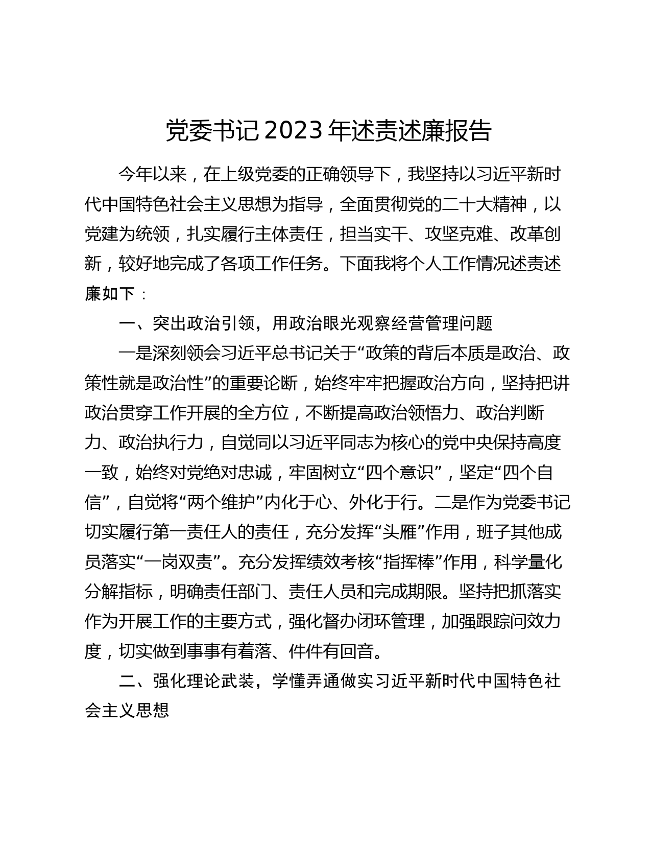 黨委書記2023年述責(zé)述廉報(bào)告今年以來(lái),在上級(jí)黨委的正確領(lǐng)導(dǎo)下,我堅(jiān)持以習(xí)近平新時(shí)代中國(guó)特色社會(huì)主義思想為指導(dǎo),全面貫徹黨的二十大精神,以黨建為統(tǒng)領(lǐng),扎實(shí)履行主體責(zé)任,擔(dān)當(dāng)實(shí)干、攻堅(jiān)克難、改革創(chuàng)新,較好地完成了各項(xiàng)工作任務(wù)。下面我將個(gè)人工作情況述責(zé)述廉如下:一、突出政治引領(lǐng),用政治眼光觀察經(jīng)營(yíng)管理問(wèn)題一是深刻領(lǐng)會(huì)習(xí)近平總書記關(guān)于“政策的背后本質(zhì)是政治、政策性就是政治性”的重要論斷,始終牢牢把握政治方向,堅(jiān)持把講政治貫穿工作開(kāi)展的全方位,不斷提高政治領(lǐng)悟力、政治判斷力、政治執(zhí)行力,自覺(jué)同以習(xí)近平同志為核心的黨中央保持高度一致,始終...