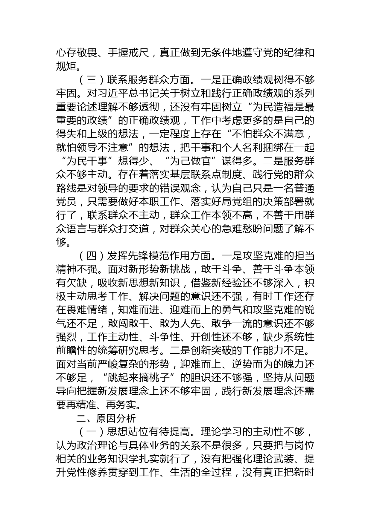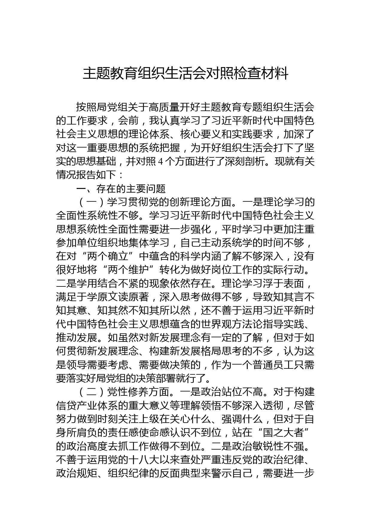 主題教育組織生活會(huì)對(duì)照檢查材料按照局黨組關(guān)于高質(zhì)量開好主題教育專題組織生活會(huì)的工作要求,會(huì)前,我認(rèn)真學(xué)習(xí)了習(xí)近平新時(shí)代中國(guó)特色社會(huì)主義思想的理論體系、核心要義和實(shí)踐要求,加深了對(duì)這一重要思想的系統(tǒng)把握,為開好組織生活會(huì)打下了堅(jiān)實(shí)的思想基礎(chǔ),并對(duì)照4個(gè)方面進(jìn)行了深刻剖析。現(xiàn)就有關(guān)情況報(bào)告如下:一、存在的主要問題(一)學(xué)習(xí)貫徹黨的創(chuàng)新理論方面。一是理論學(xué)習(xí)的全面性系統(tǒng)性不夠。學(xué)習(xí)習(xí)近平新時(shí)代中國(guó)特色社會(huì)主義思想系統(tǒng)性全面性需要進(jìn)一步強(qiáng)化,平時(shí)學(xué)習(xí)中更加注重參加單位組織地集體學(xué)習(xí),自己主動(dòng)系統(tǒng)學(xué)的時(shí)間不夠,在對(duì)“兩個(gè)確立”中蘊(yùn)含的...
