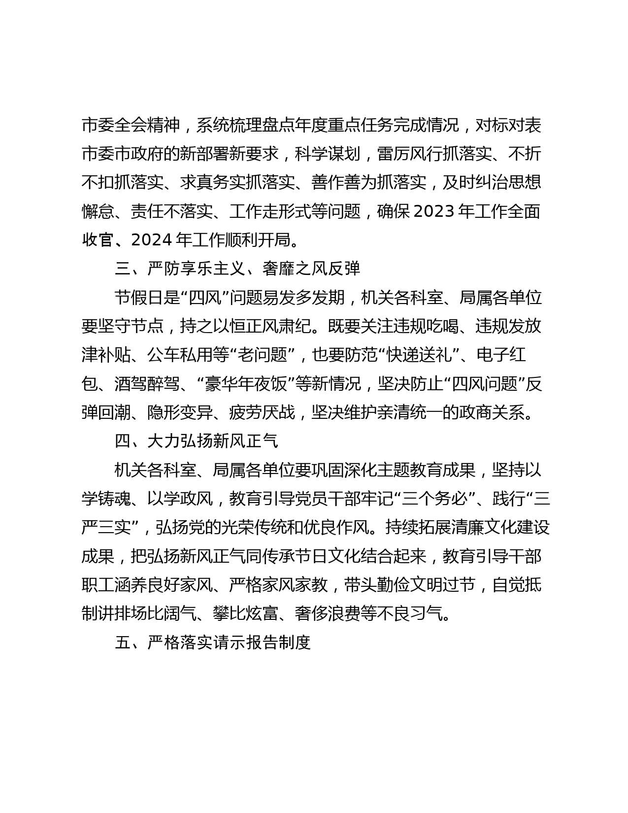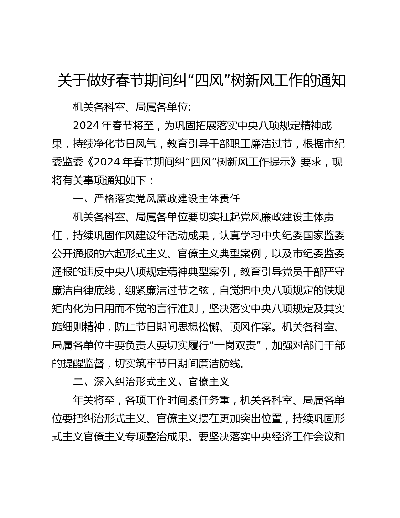 關(guān)于做好春節(jié)期間糾“四風(fēng)”樹新風(fēng)工作的通知機(jī)關(guān)各科室、局屬各單位:2024年春節(jié)將至,為鞏固拓展落實(shí)中央八項(xiàng)規(guī)定精神成果,持續(xù)凈化節(jié)日風(fēng)氣,教育引導(dǎo)干部職工廉潔過節(jié),根據(jù)市紀(jì)委監(jiān)委《2024年春節(jié)期間糾“四風(fēng)”樹新風(fēng)工作提示》要求,現(xiàn)將有關(guān)事項(xiàng)通知如下:一、嚴(yán)格落實(shí)黨風(fēng)廉政建設(shè)主體責(zé)任機(jī)關(guān)各科室、局屬各單位要切實(shí)扛起黨風(fēng)廉政建設(shè)主體責(zé)任,持續(xù)鞏固作風(fēng)建設(shè)年活動(dòng)成果,認(rèn)真學(xué)習(xí)中央紀(jì)委國家監(jiān)委公開通報(bào)的六起形式主義、官僚主義典型案例,以及市紀(jì)委監(jiān)委通報(bào)的違反中央八項(xiàng)規(guī)定精神典型案例,教育引導(dǎo)黨員干部嚴(yán)守廉潔自律底線,繃緊廉潔過節(jié)之弦,自...