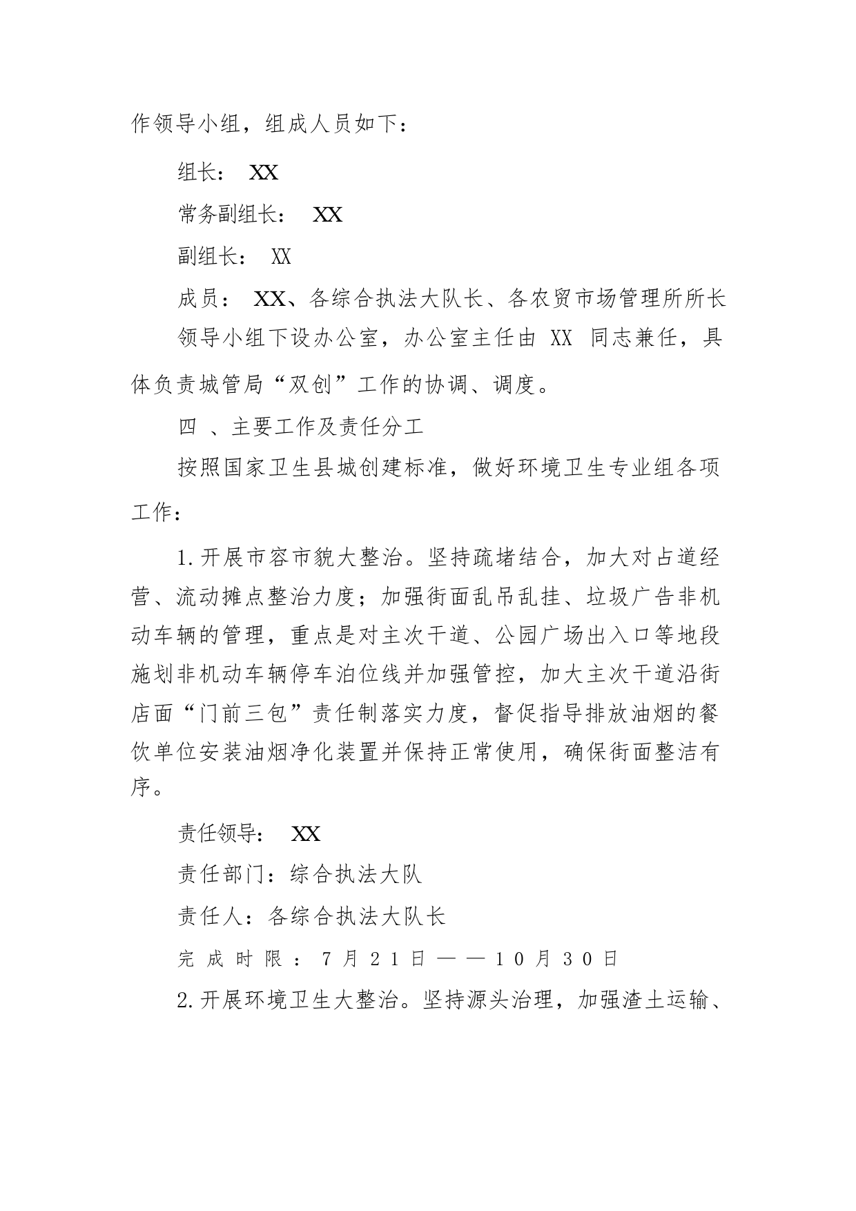 XX縣城管局創(chuàng)建國家衛(wèi)生縣和深化文明城市創(chuàng)建“百日攻堅”行動工作方案為進一步加強城市管理,改善人居環(huán)境,提升城市品位,塑造干凈、整潔、文明、有序的城市環(huán)境,根據(jù)我縣創(chuàng)國衛(wèi)工作研判暨專家現(xiàn)場技術(shù)指導(dǎo)工作復(fù)盤分析會精神,按照縣委、縣政府總體部署,結(jié)合本單位實際,制定本方案。一、指導(dǎo)思想圍繞“品質(zhì)XX”與“秀美XX”建設(shè)要求,按照“分級負責(zé)、上下聯(lián)動、責(zé)任明晰、綜合整治、長效管理”原則,著力提升城市管理水平,確保城區(qū)環(huán)境有新變化、新提升,不斷增強人民群眾的獲得感、幸福感、安全感和歸屬感。二、目標(biāo)任務(wù)按照國家衛(wèi)生縣城標(biāo)準,改善縣城環(huán)境衛(wèi)生...