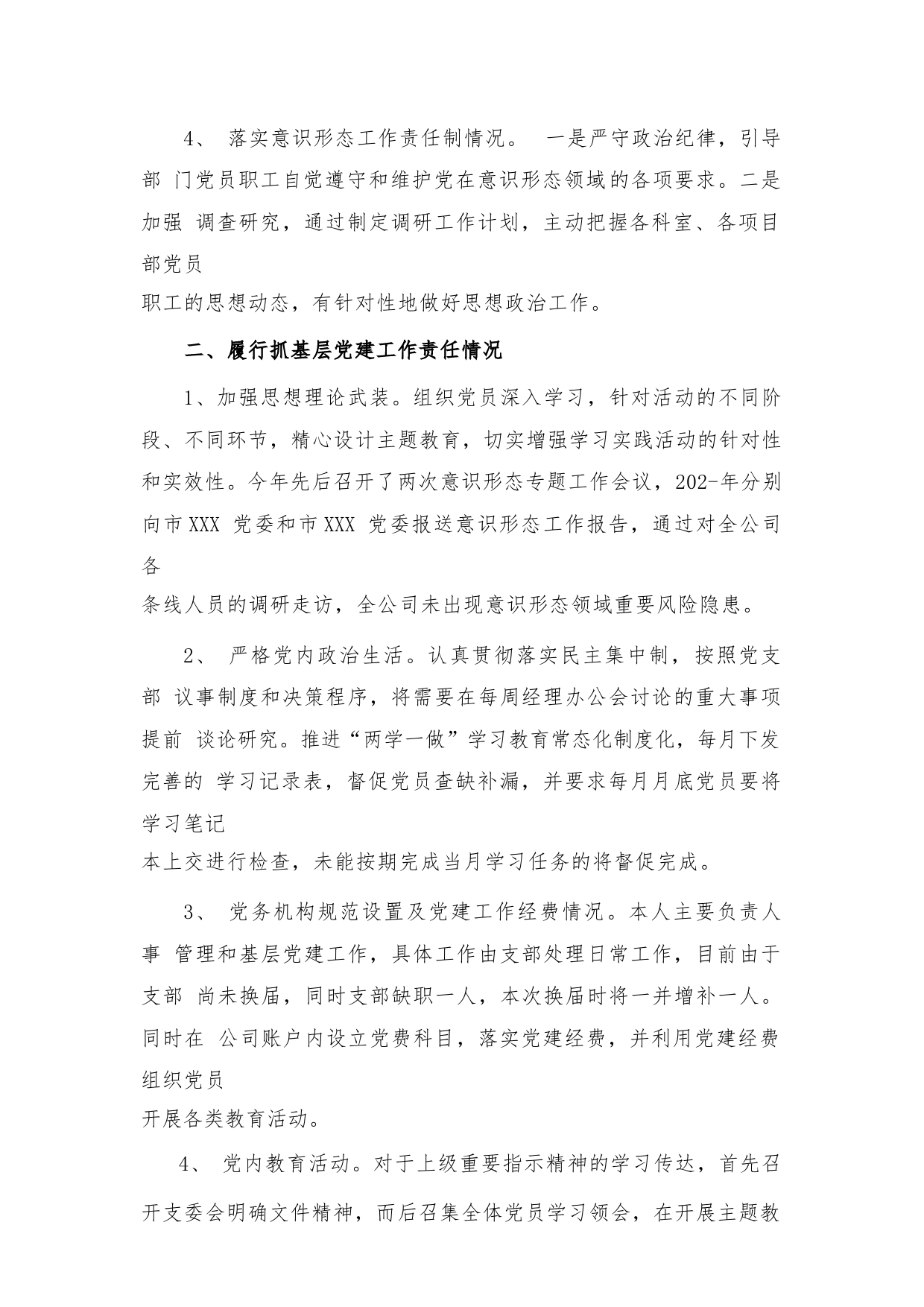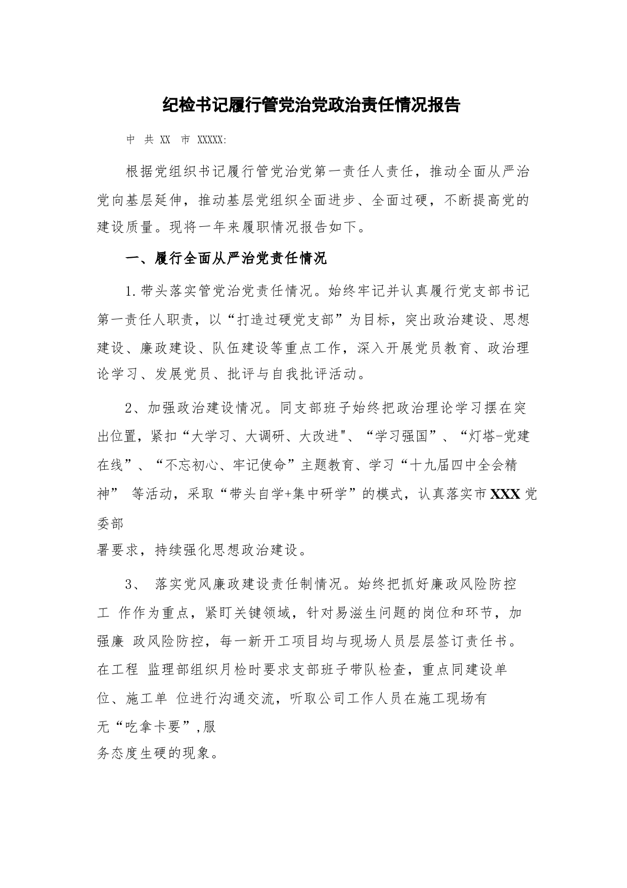 紀(jì)檢書記履行管黨治黨政治責(zé)任情況報(bào)告中共XX市XXXXX:根據(jù)黨組織書記履行管黨治黨第一責(zé)任人責(zé)任,推動(dòng)全面從嚴(yán)治黨向基層延伸,推動(dòng)基層黨組織全面進(jìn)步、全面過硬,不斷提高黨的建設(shè)質(zhì)量。現(xiàn)將一年來履職情況報(bào)告如下。一、履行全面從嚴(yán)治黨責(zé)任情況1.帶頭落實(shí)管黨治黨責(zé)任情況。始終牢記并認(rèn)真履行黨支部書記第一責(zé)任人職責(zé),以“打造過硬黨支部”為目標(biāo),突出政治建設(shè)、思想建設(shè)、廉政建設(shè)、隊(duì)伍建設(shè)等重點(diǎn)工作,深入開展黨員教育、政治理論學(xué)習(xí)、發(fā)展黨員、批評(píng)與自我批評(píng)活動(dòng)。2、加強(qiáng)政治建設(shè)情況。同支部班子始終把政治理論學(xué)習(xí)擺在突出位置,緊扣“大學(xué)習(xí)、大調(diào)...