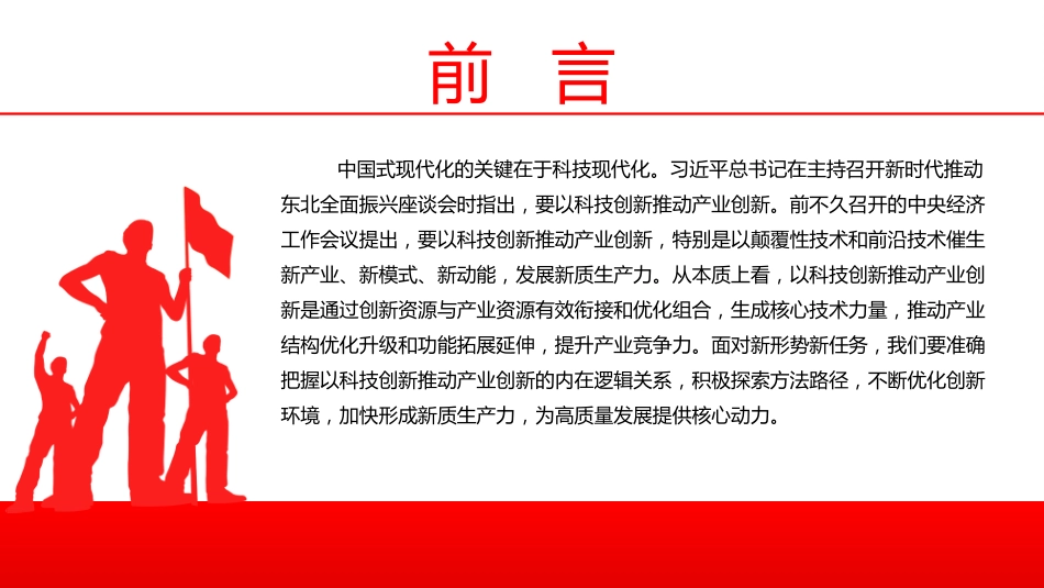 匯報(bào):某某某時(shí)間:2023.12.21以科技創(chuàng)新推動(dòng)產(chǎn)業(yè)創(chuàng)新——學(xué)習(xí)貫徹習(xí)近平新時(shí)代經(jīng)濟(jì)發(fā)展思想——前言中國式現(xiàn)代化的關(guān)鍵在于科技現(xiàn)代化。習(xí)近平總書記在主持召開新時(shí)代推動(dòng)?xùn)|北全面振興座談會(huì)時(shí)指出,要以科技創(chuàng)新推動(dòng)產(chǎn)業(yè)創(chuàng)新。前不久召開的中央經(jīng)濟(jì)工作會(huì)議提出,要以科技創(chuàng)新推動(dòng)產(chǎn)業(yè)創(chuàng)新,特別是以顛覆性技術(shù)和前沿技術(shù)催生新產(chǎn)業(yè)、新模式、新動(dòng)能,發(fā)展新質(zhì)生產(chǎn)力。從本質(zhì)上看,以科技創(chuàng)新推動(dòng)產(chǎn)業(yè)創(chuàng)新是通過創(chuàng)新資源與產(chǎn)業(yè)資源有效銜接和優(yōu)化組合,生成核心技術(shù)力量,推動(dòng)產(chǎn)業(yè)結(jié)構(gòu)優(yōu)化升級和功能拓展延伸,提升產(chǎn)業(yè)競爭力。面對新形勢新任務(wù),我們要準(zhǔn)確把握以科技...