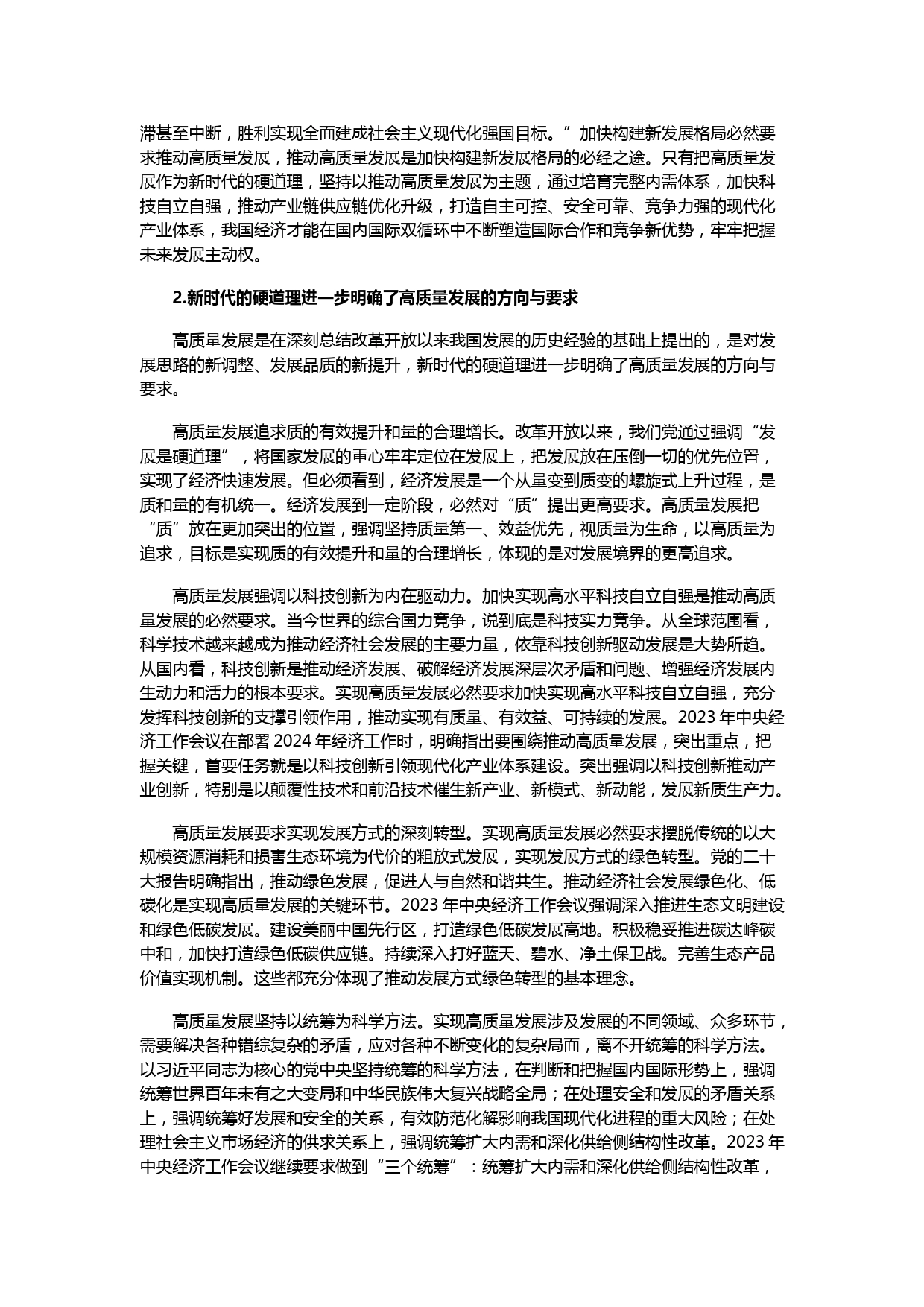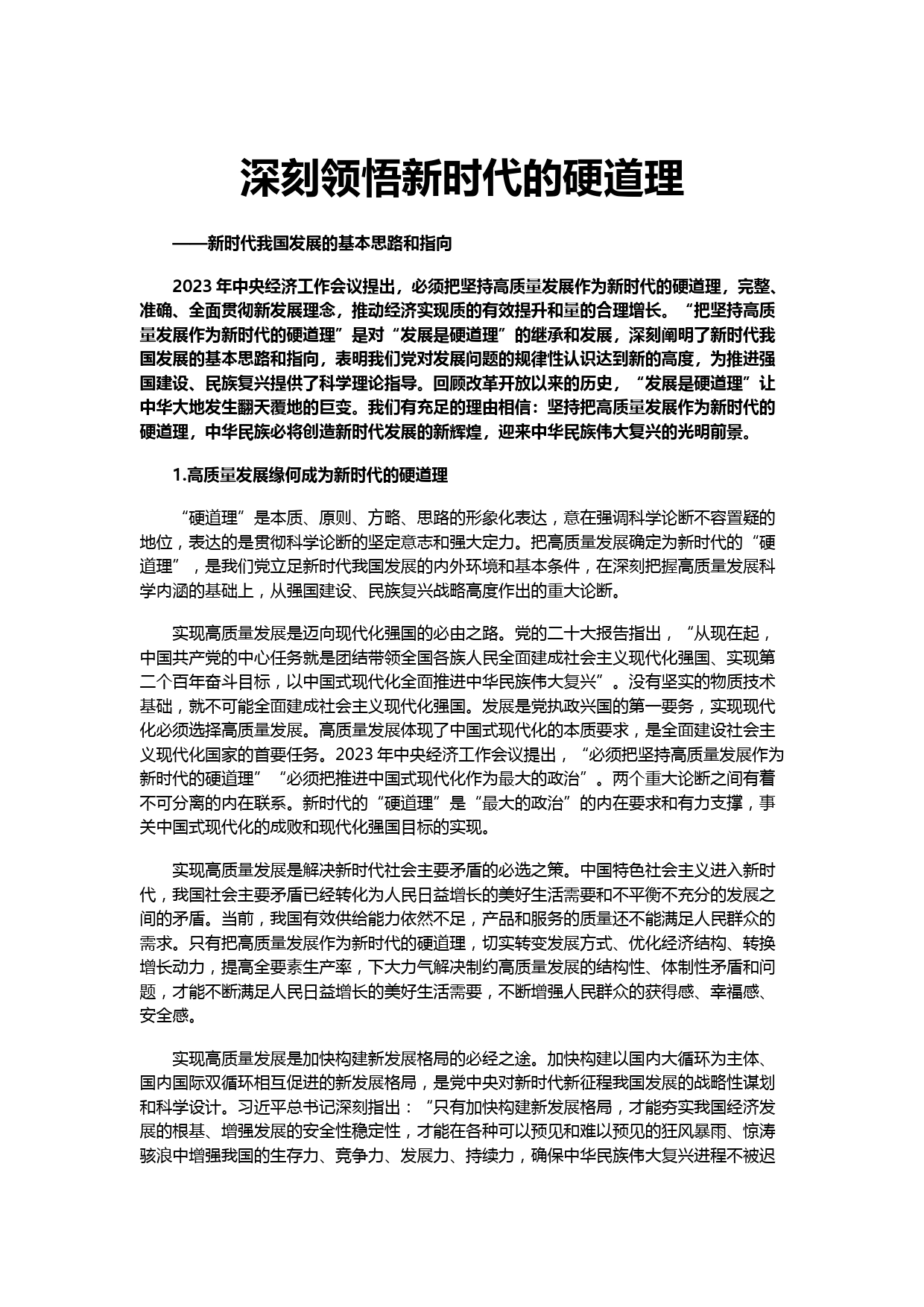 深刻領(lǐng)悟新時代的硬道理——新時代我國發(fā)展的基本思路和指向2023年中央經(jīng)濟工作會議提出,必須把堅持高質(zhì)量發(fā)展作為新時代的硬道理,完整、準(zhǔn)確、全面貫徹新發(fā)展理念,推動經(jīng)濟實現(xiàn)質(zhì)的有效提升和量的合理增長?!鞍褕猿指哔|(zhì)量發(fā)展作為新時代的硬道理”是對“發(fā)展是硬道理”的繼承和發(fā)展,深刻闡明了新時代我國發(fā)展的基本思路和指向,表明我們黨對發(fā)展問題的規(guī)律性認識達到新的高度,為推進強國建設(shè)、民族復(fù)興提供了科學(xué)理論指導(dǎo)。回顧改革開放以來的歷史,“發(fā)展是硬道理”讓中華大地發(fā)生翻天覆地的巨變。我們有充足的理由相信:堅持把高質(zhì)量發(fā)展作為新時代的硬道理,中...