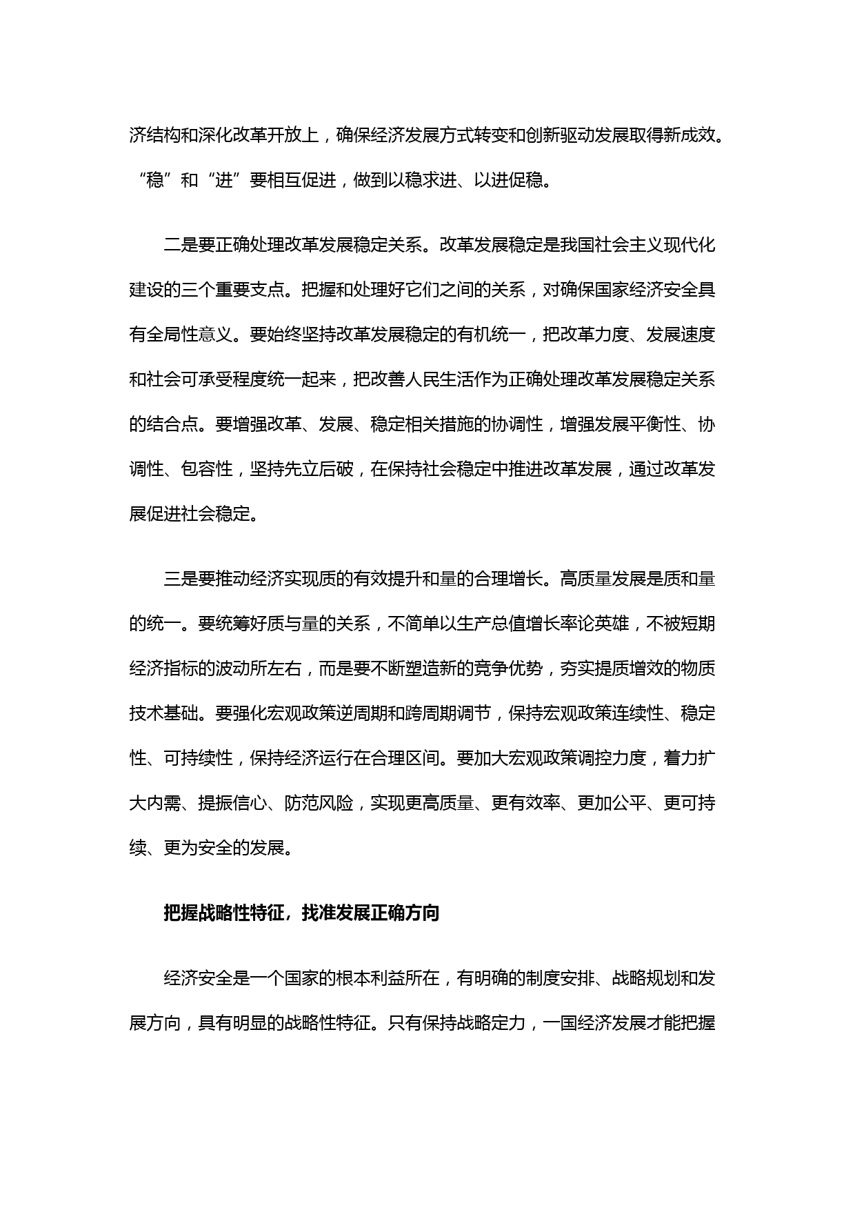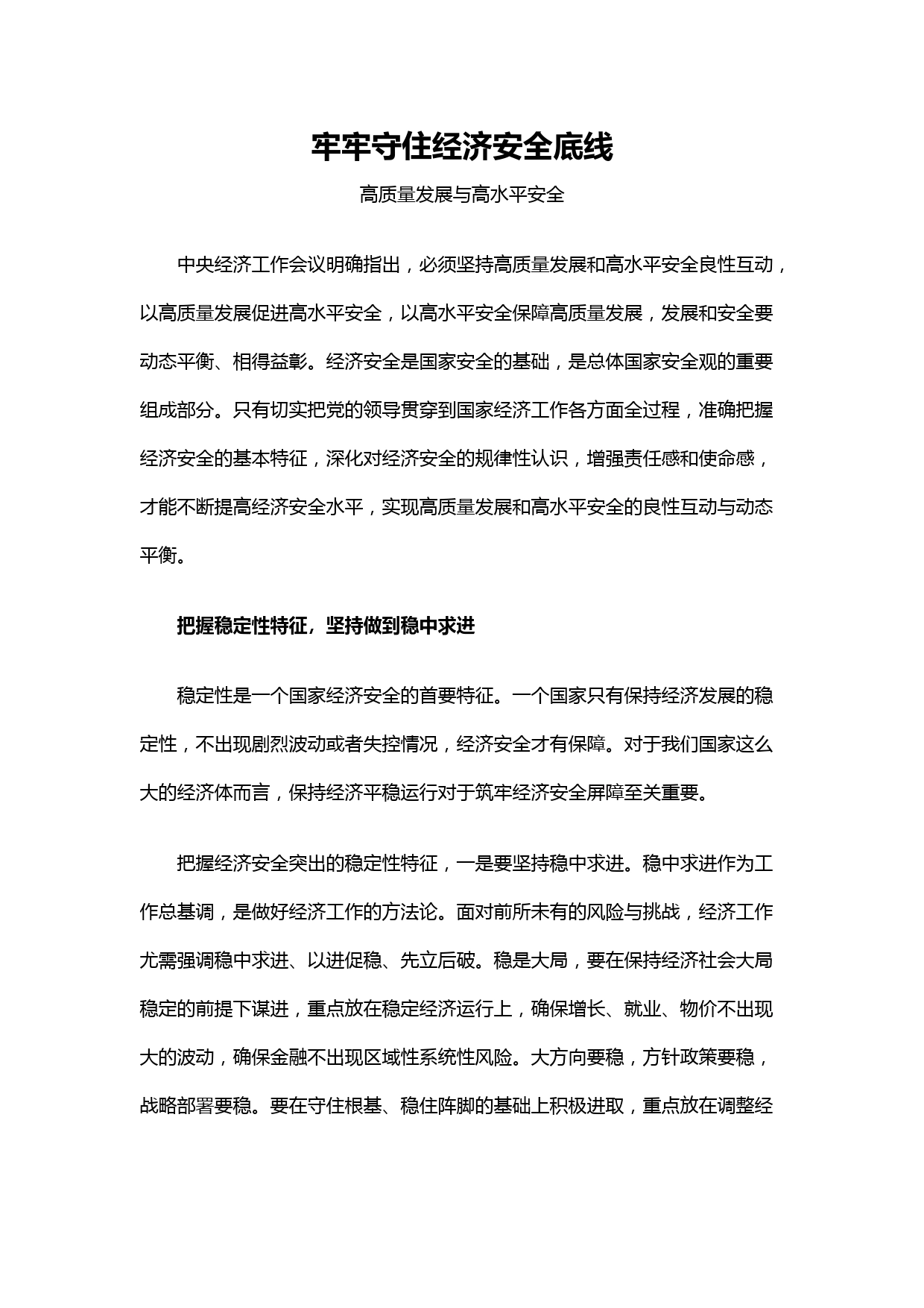 牢牢守住經濟安全底線高質量發(fā)展與高水平安全中央經濟工作會議明確指出,必須堅持高質量發(fā)展和高水平安全良性互動,以高質量發(fā)展促進高水平安全,以高水平安全保障高質量發(fā)展,發(fā)展和安全要動態(tài)平衡、相得益彰。經濟安全是國家安全的基礎,是總體國家安全觀的重要組成部分。只有切實把黨的領導貫穿到國家經濟工作各方面全過程,準確把握經濟安全的基本特征,深化對經濟安全的規(guī)律性認識,增強責任感和使命感,才能不斷提高經濟安全水平,實現高質量發(fā)展和高水平安全的良性互動與動態(tài)平衡。把握穩(wěn)定性特征,堅持做到穩(wěn)中求進穩(wěn)定性是一個國家經濟安全的首要特征。一個國家...