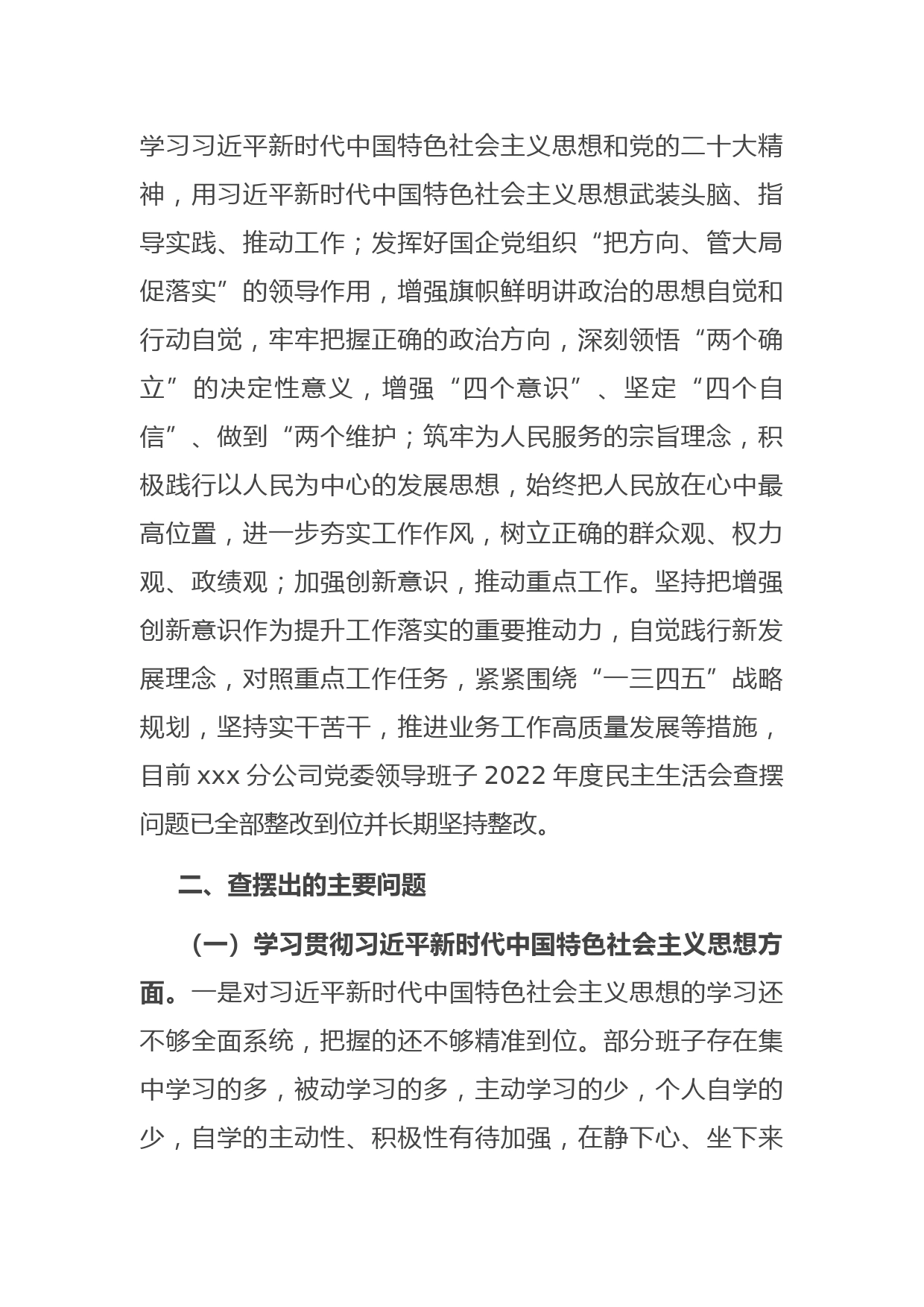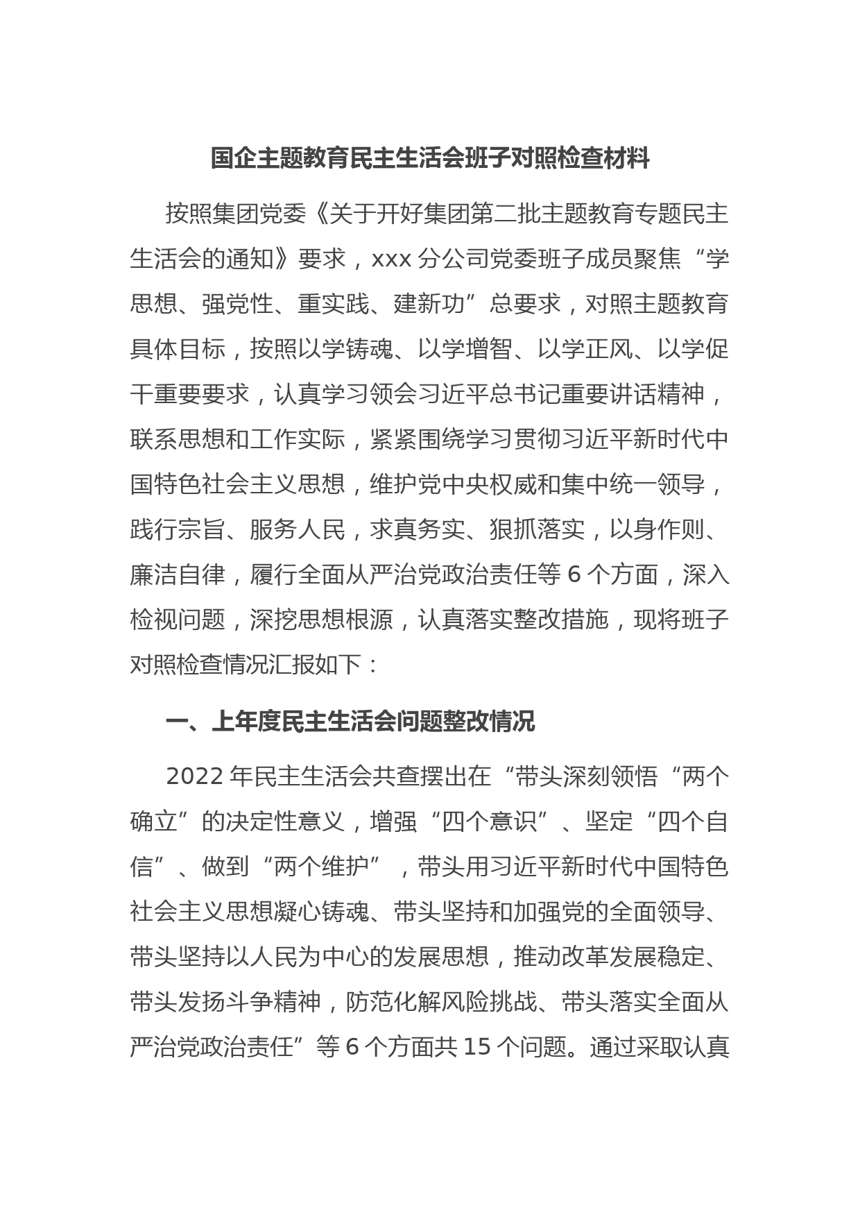 國企主題教育民主生活會班子對照檢查材料按照集團黨委《關(guān)于開好集團第二批主題教育專題民主生活會的通知》要求,xxx分公司黨委班子成員聚焦“學(xué)思想、強黨性、重實踐、建新功”總要求,對照主題教育具體目標,按照以學(xué)鑄魂、以學(xué)增智、以學(xué)正風(fēng)、以學(xué)促干重要要求,認真學(xué)習(xí)領(lǐng)會習(xí)近平總書記重要講話精神,聯(lián)系思想和工作實際,緊緊圍繞學(xué)習(xí)貫徹習(xí)近平新時代中國特色社會主義思想,維護黨中央權(quán)威和集中統(tǒng)一領(lǐng)導(dǎo),踐行宗旨、服務(wù)人民,求真務(wù)實、狠抓落實,以身作則、廉潔自律,履行全面從嚴治黨政治責(zé)任等6個方面,深入檢視問題,深挖思想根源,認真落實整改措施,現(xiàn)將...
