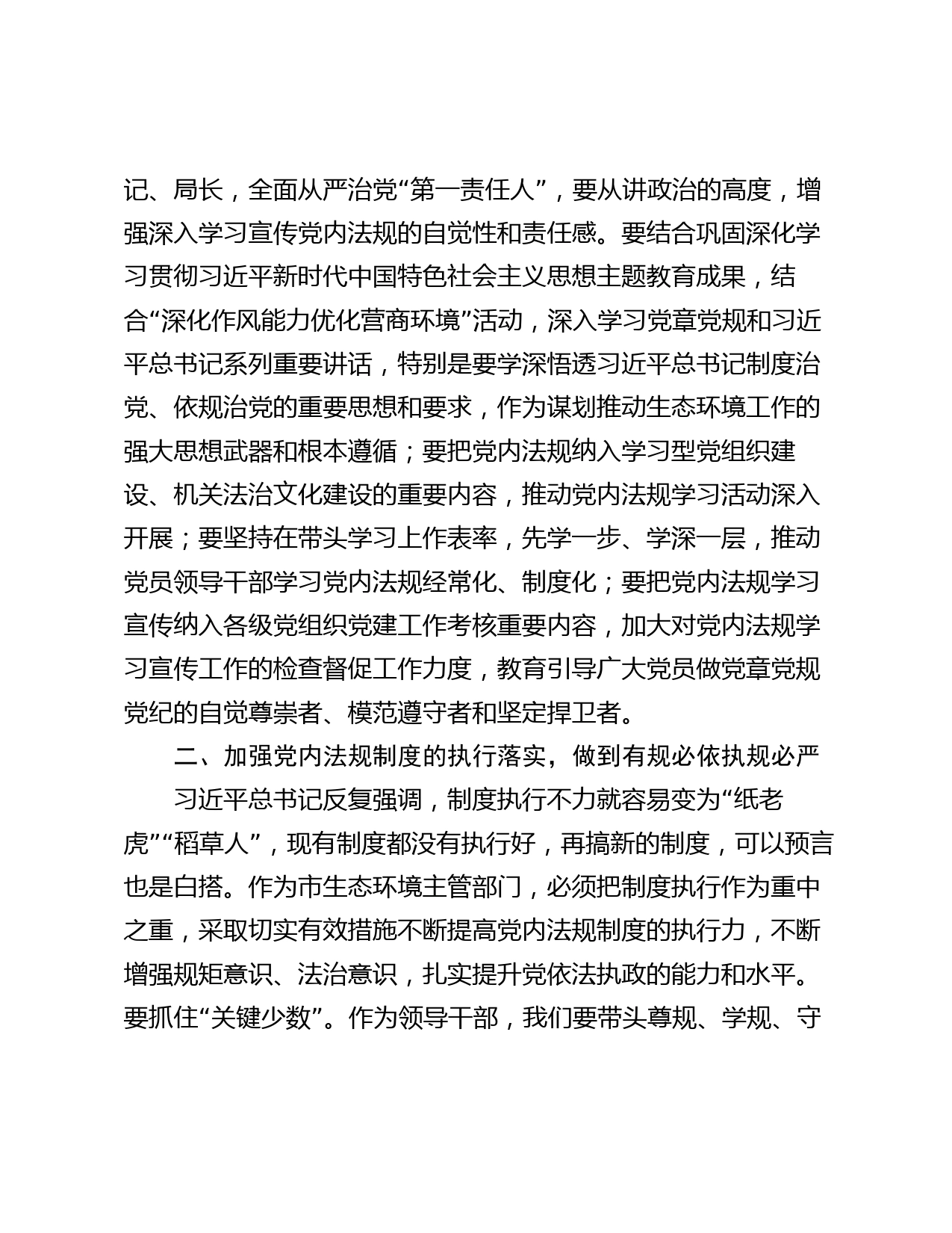 2024年黨組理論中心組黨內(nèi)法規(guī)專(zhuān)題研討發(fā)言提綱下面,結(jié)合這次黨組理論學(xué)習(xí)中心組集體學(xué)習(xí),就學(xué)習(xí)宣傳貫徹黨內(nèi)法規(guī)談?wù)剬W(xué)習(xí)體悟。習(xí)近平總書(shū)記指出,我黨歷來(lái)重視黨內(nèi)法規(guī)制度建設(shè),注重運(yùn)用黨內(nèi)法規(guī)管黨治黨、提高黨的執(zhí)政能力和領(lǐng)導(dǎo)水平。我們要深刻認(rèn)識(shí)加強(qiáng)黨內(nèi)法規(guī)工作是落實(shí)全面從嚴(yán)治黨的必然要求,是推進(jìn)全面深化改革的重要內(nèi)容,是加快推進(jìn)我市生態(tài)環(huán)境工作布局、奮力實(shí)現(xiàn)市第次黨代會(huì)目標(biāo)的迫切需要,要切實(shí)增強(qiáng)思想自覺(jué)、政治自覺(jué)、行動(dòng)自覺(jué),牢牢把握黨內(nèi)法規(guī)工作的正確方向,不斷強(qiáng)化“四個(gè)意識(shí)”,把黨章作為根本遵循,把維護(hù)黨中央集中統(tǒng)一領(lǐng)導(dǎo)作為根本的...