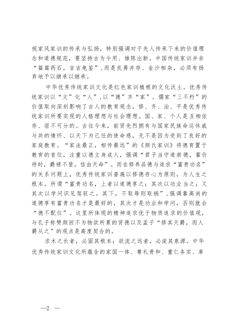 黨課:深入推進(jìn)“第二個(gè)結(jié)合”傳承弘揚(yáng)紅色家訓(xùn)同志們:習(xí)近平總書(shū)記強(qiáng)調(diào):“在五千多年中華文明深厚基礎(chǔ)上開(kāi)辟和發(fā)展中國(guó)特色社會(huì)主義,把馬克思主義基本原理同中國(guó)具體實(shí)際、同中華優(yōu)秀傳統(tǒng)文化相結(jié)合是必由之路?!奔t色家訓(xùn)文化是中華優(yōu)秀傳統(tǒng)家訓(xùn)文化的升華,是馬克思主義中國(guó)化時(shí)代化的結(jié)晶,是中國(guó)共產(chǎn)黨政治文化的重要標(biāo)識(shí)。弘揚(yáng)紅色家訓(xùn),對(duì)于我們?cè)谛碌臍v史起點(diǎn)上繼續(xù)推動(dòng)文化繁榮、更好擔(dān)負(fù)起新的文化使命意義重大。一、開(kāi)啟中華優(yōu)秀傳統(tǒng)家訓(xùn)文脈傳承新階段端蒙養(yǎng)、重家訓(xùn)是中華民族的優(yōu)秀文化傳統(tǒng)。在家國(guó)同構(gòu)的傳統(tǒng)宗法社會(huì)中,家訓(xùn)是國(guó)法的重要支撐和補(bǔ)充,...