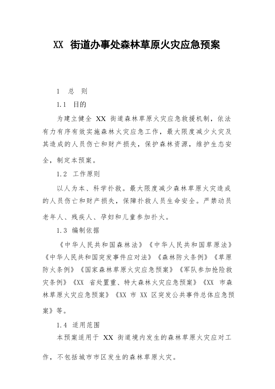 XX街道辦事處森林草原火災(zāi)應(yīng)急預(yù)案1總則1.1目的為建立健全XX街道森林草原火災(zāi)應(yīng)急救援機(jī)制,依法有力有序有效實(shí)施森林火災(zāi)應(yīng)急工作,最大限度減少火災(zāi)及其造成的人員傷亡和財(cái)產(chǎn)損失,保護(hù)森林資源,維護(hù)生態(tài)安全,制定本預(yù)案。1.2工作原則以人為本、科學(xué)撲救。最大限度減少森林草原火災(zāi)造成的人員傷亡和財(cái)產(chǎn)損失,保障撲救人員生命安全。嚴(yán)禁動(dòng)員老年人、殘疾人、孕婦和兒童參加撲火。1.3編制依據(jù)《中華人民共和國(guó)森林法》《中華人民共和國(guó)草原法》《中華人民共和國(guó)突發(fā)事件應(yīng)對(duì)法》《森林防火條例》《草原防火條例》《國(guó)家森林草原火災(zāi)應(yīng)急預(yù)案》《軍隊(duì)參加搶險(xiǎn)救災(zāi)條例...