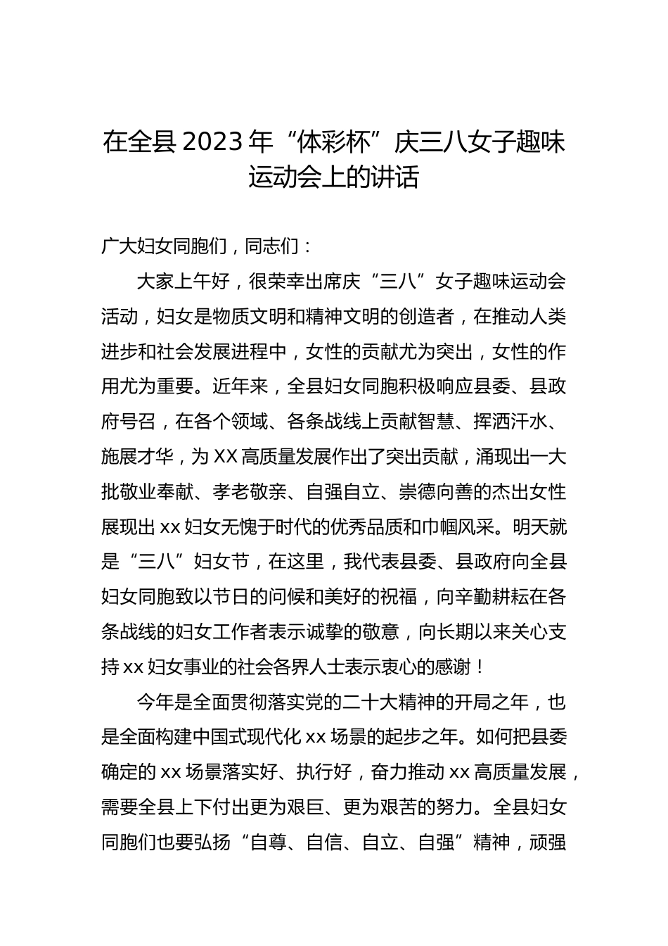 在全縣2023年“體彩杯”慶三八女子趣味運(yùn)動(dòng)會(huì)上的講話VIP免費(fèi)
