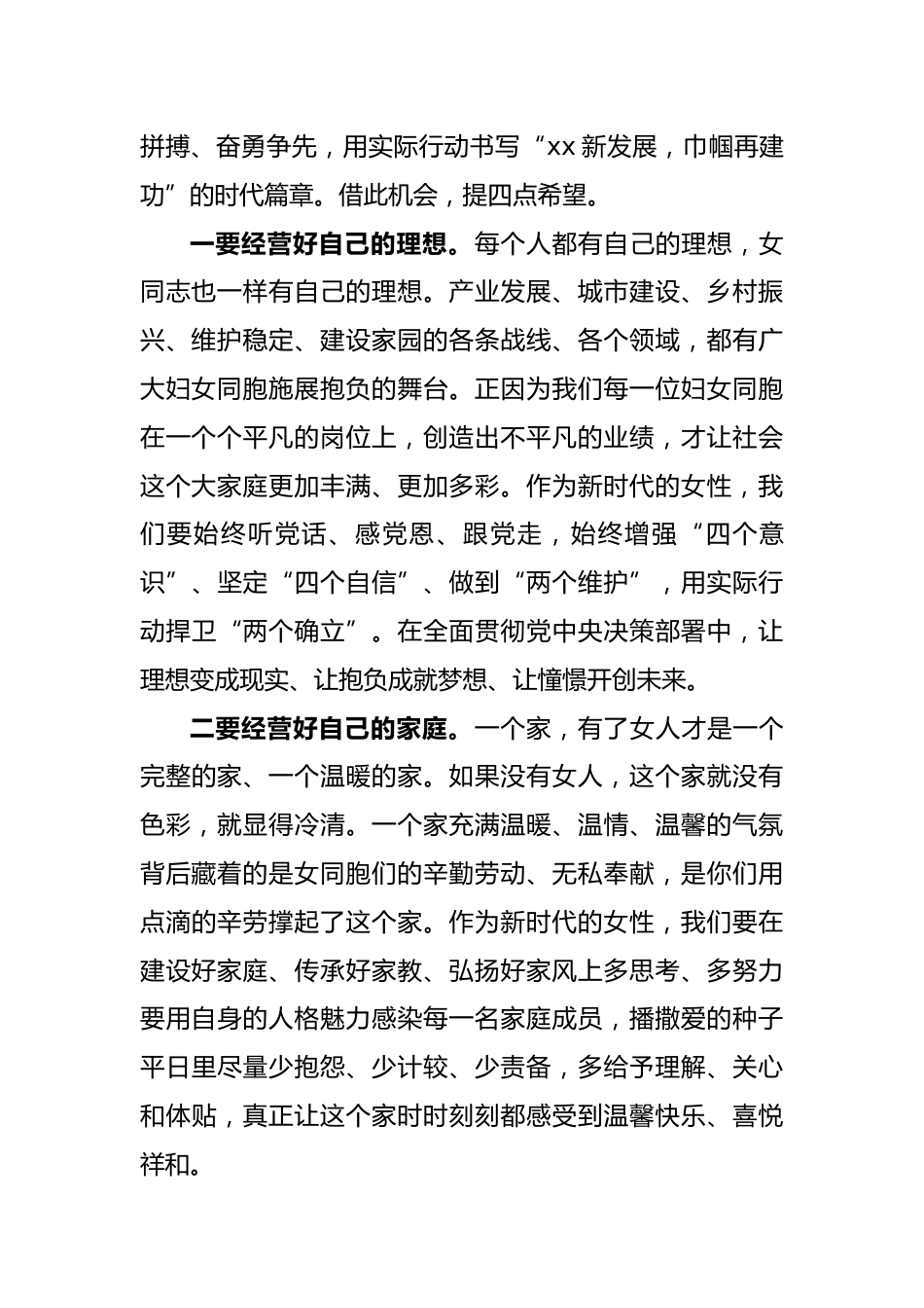 在全縣2023年“體彩杯”慶三八女子趣味運(yùn)動(dòng)會(huì)上的講話廣大婦女同胞們,同志們:大家上午好,很榮幸出席慶“三八”女子趣味運(yùn)動(dòng)會(huì)活動(dòng),婦女是物質(zhì)文明和精神文明的創(chuàng)造者,在推動(dòng)人類進(jìn)步和社會(huì)發(fā)展進(jìn)程中,女性的貢獻(xiàn)尤為突出,女性的作用尤為重要。近年來(lái),全縣婦女同胞積極響應(yīng)縣委、縣政府號(hào)召,在各個(gè)領(lǐng)域、各條戰(zhàn)線上貢獻(xiàn)智慧、揮灑汗水、施展才華,為XX高質(zhì)量發(fā)展作出了突出貢獻(xiàn),涌現(xiàn)出一大批敬業(yè)奉獻(xiàn)、孝老敬親、自強(qiáng)自立、崇德向善的杰出女性展現(xiàn)出xx婦女無(wú)愧于時(shí)代的優(yōu)秀品質(zhì)和巾幗風(fēng)采。明天就是“三八”婦女節(jié),在這里,我代表縣委、縣政府向全縣婦女同胞致...