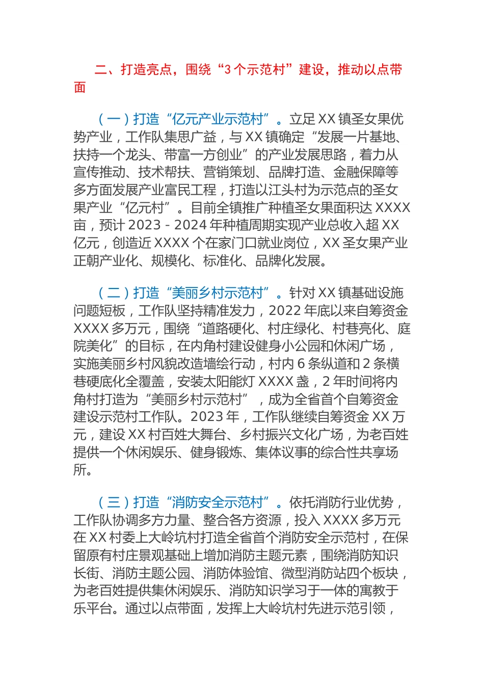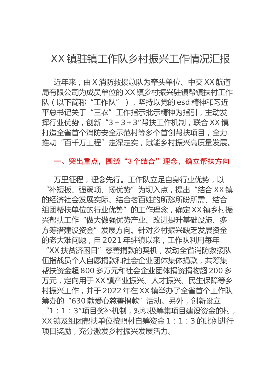 XX鎮(zhèn)駐鎮(zhèn)工作隊(duì)鄉(xiāng)村振興工作情況匯報(bào)近年來(lái),由X消防救援總隊(duì)為牽頭單位、中交XX航道局有限公司為成員單位的XX鎮(zhèn)鄉(xiāng)村振興駐鎮(zhèn)幫鎮(zhèn)扶村工作隊(duì)(以下簡(jiǎn)稱“工作隊(duì)”),堅(jiān)持以黨的esd精神和習(xí)近平總書記關(guān)于“三農(nóng)”工作指示批示精神為指引,主動(dòng)發(fā)揮行業(yè)優(yōu)勢(shì),創(chuàng)新“3+3+3”幫扶工作機(jī)制,聯(lián)合XX鎮(zhèn)打造全省首個(gè)消防安全示范村等多個(gè)首創(chuàng)幫扶項(xiàng)目,全力推動(dòng)“百千萬(wàn)工程”走深走實(shí),賦能鄉(xiāng)村振興高質(zhì)量發(fā)展。一、突出重點(diǎn),圍繞“3個(gè)結(jié)合”理念,確立幫扶方向萬(wàn)里征程,理念先行。工作隊(duì)立足自身行業(yè)優(yōu)勢(shì),以“補(bǔ)短板、強(qiáng)弱項(xiàng)、揚(yáng)優(yōu)勢(shì)”為切入點(diǎn),提出“結(jié)合XX鎮(zhèn)的經(jīng)濟(jì)社...
