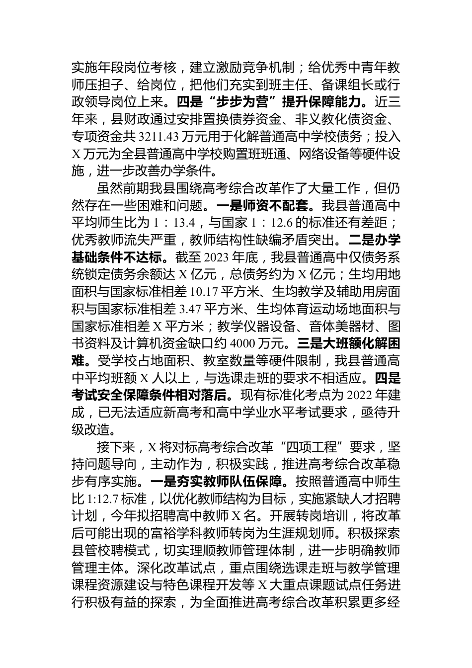 縣在全市2024年教育大會(huì)上的交流發(fā)言在市委市政府的堅(jiān)強(qiáng)領(lǐng)導(dǎo)下,我縣堅(jiān)持以習(xí)近平新時(shí)代中國(guó)特色社會(huì)主義思想為指導(dǎo),全面貫徹落實(shí)黨的二十大、中央省市全會(huì)、全國(guó)全省教育大會(huì)精神,始終把教育擺在優(yōu)先發(fā)展的戰(zhàn)略地位上,按照國(guó)家和省高考綜合改革整體部署,統(tǒng)籌謀劃,積極探索,推動(dòng)全縣高考綜合改革“蹄疾而步穩(wěn)”。現(xiàn)將工作開展情況簡(jiǎn)要匯報(bào),不妥之處敬請(qǐng)批評(píng)指正。X現(xiàn)有公辦普通高中3所(省一級(jí)示范性普通高中1所、省二級(jí)示范性普通高中2所)、民辦普通高中1所,教職工X人,在校學(xué)生X人。高考上線人數(shù)連續(xù)10余年名列全省百萬人口大縣前列,連續(xù)多年榮獲綿陽市普通...