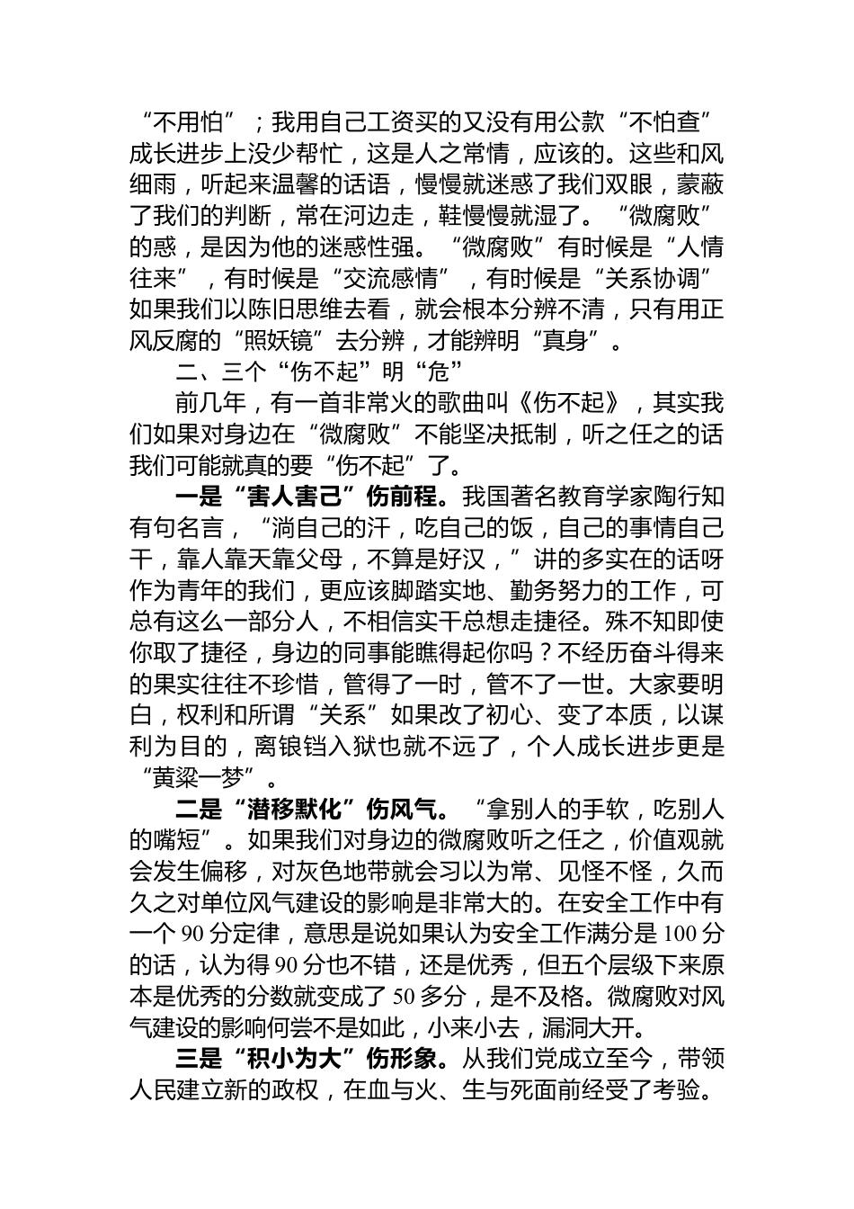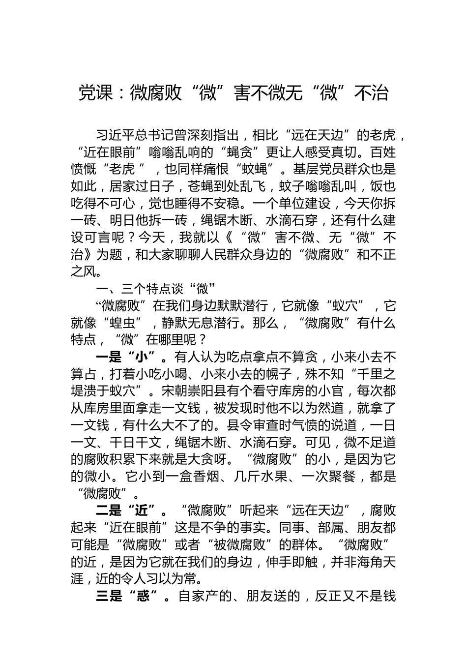 黨課:微腐敗“微”害不微無“微”不治習近平總書記曾深刻指出,相比“遠在天邊”的老虎,“近在眼前”嗡嗡亂響的“蠅貪”更讓人感受真切。百姓憤慨“老虎”,也同樣痛恨“蚊蠅”?;鶎狱h員群眾也是如此,居家過日子,蒼蠅到處亂飛,蚊子嗡嗡亂叫,飯也吃得不可心,覺也睡得不安穩(wěn)。一個單位建設(shè),今天你拆一磚、明日他拆一磚,繩鋸木斷、水滴石穿,還有什么建設(shè)可言呢?今天,我就以《“微”害不微、無“微”不治》為題,和大家聊聊人民群眾身邊的“微腐敗”和不正之風。一、三個特點談“微”“微腐敗”在我們身邊默默潛行,它就像“蟻穴”,它就像“蝗蟲”,靜默無息潛...