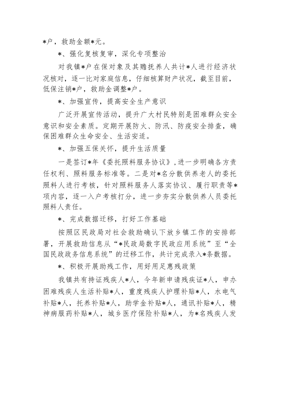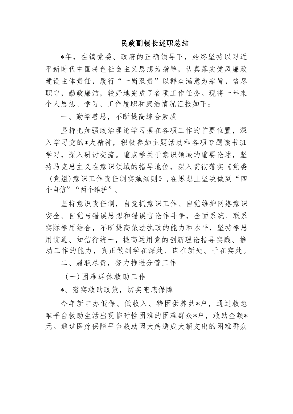 民政副鎮(zhèn)長述職總結*年,在鎮(zhèn)黨委、政府的正確領導下,始終堅持以習近平新時代中國特色社會主義思想為指導,認真落實黨風廉政建設主體責任,履行“一崗雙責”以群眾滿意為宗旨,恪盡職守,勤政廉潔,較好地完成了各項工作任務。現將一年來個人思想、學習、工作履職和廉潔情況匯報如下:一、勤學善思,不斷提高綜合素質堅持把加強政治理論學習擺在各項工作的首要位置,深入學習黨的*大精神,積極參加主題活動和各項專題讀書班學習,深入研討交流。重點學關于意識領域的重要論述,堅持馬克思主義在意識領域的指導地位,深入貫徹落實《黨委(黨組)意識工作責任制實施細則》,...