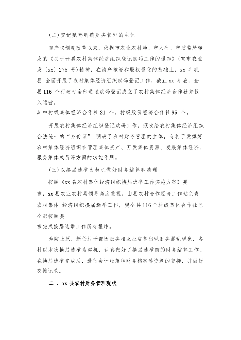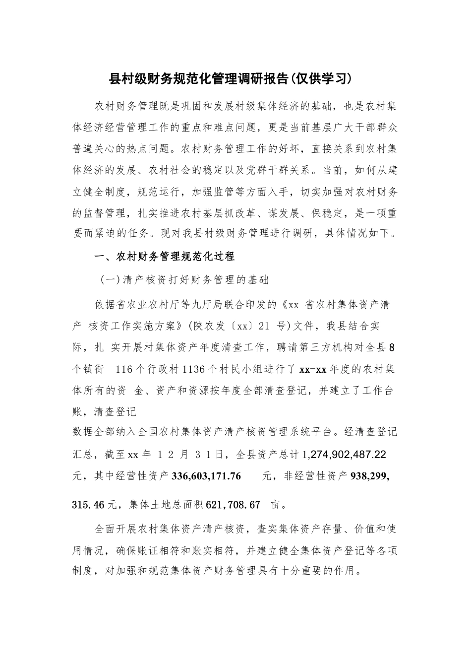 縣村級財務(wù)規(guī)范化管理調(diào)研報告(僅供學(xué)習(xí))農(nóng)村財務(wù)管理既是鞏固和發(fā)展村級集體經(jīng)濟的基礎(chǔ),也是農(nóng)村集體經(jīng)濟經(jīng)營管理工作的重點和難點問題,更是當(dāng)前基層廣大干部群眾普遍關(guān)心的熱點問題。農(nóng)村財務(wù)管理工作的好壞,直接關(guān)系到農(nóng)村集體經(jīng)濟的發(fā)展、農(nóng)村社會的穩(wěn)定以及黨群干群關(guān)系。當(dāng)前,如何從建立健全制度,規(guī)范運行,加強監(jiān)管等方面入手,切實加強對農(nóng)村財務(wù)的監(jiān)督管理,扎實推進農(nóng)村基層抓改革、謀發(fā)展、保穩(wěn)定,是一項重要而緊迫的任務(wù)?,F(xiàn)對我縣村級財務(wù)管理進行調(diào)研,具體情況如下。一、農(nóng)村財務(wù)管理規(guī)范化過程(一)清產(chǎn)核資打好財務(wù)管理的基礎(chǔ)依據(jù)省農(nóng)業(yè)農(nóng)村廳等九...