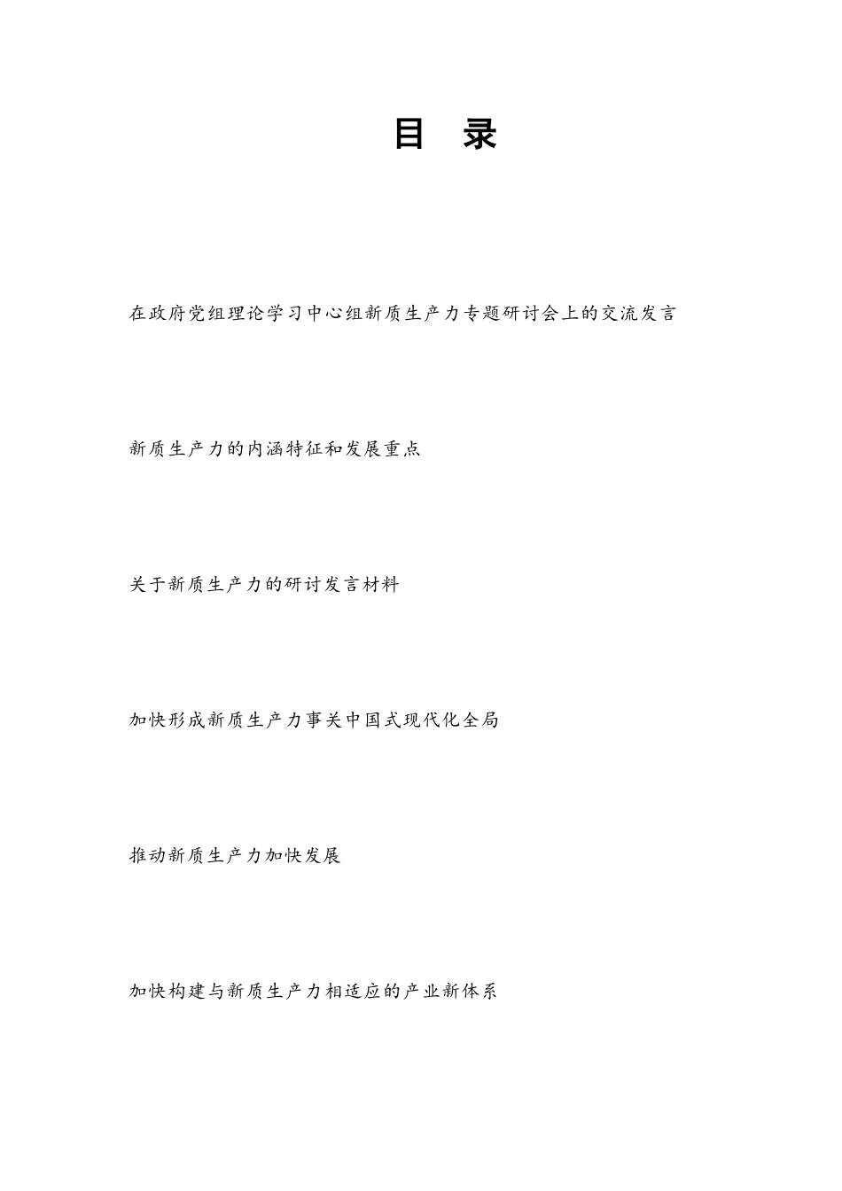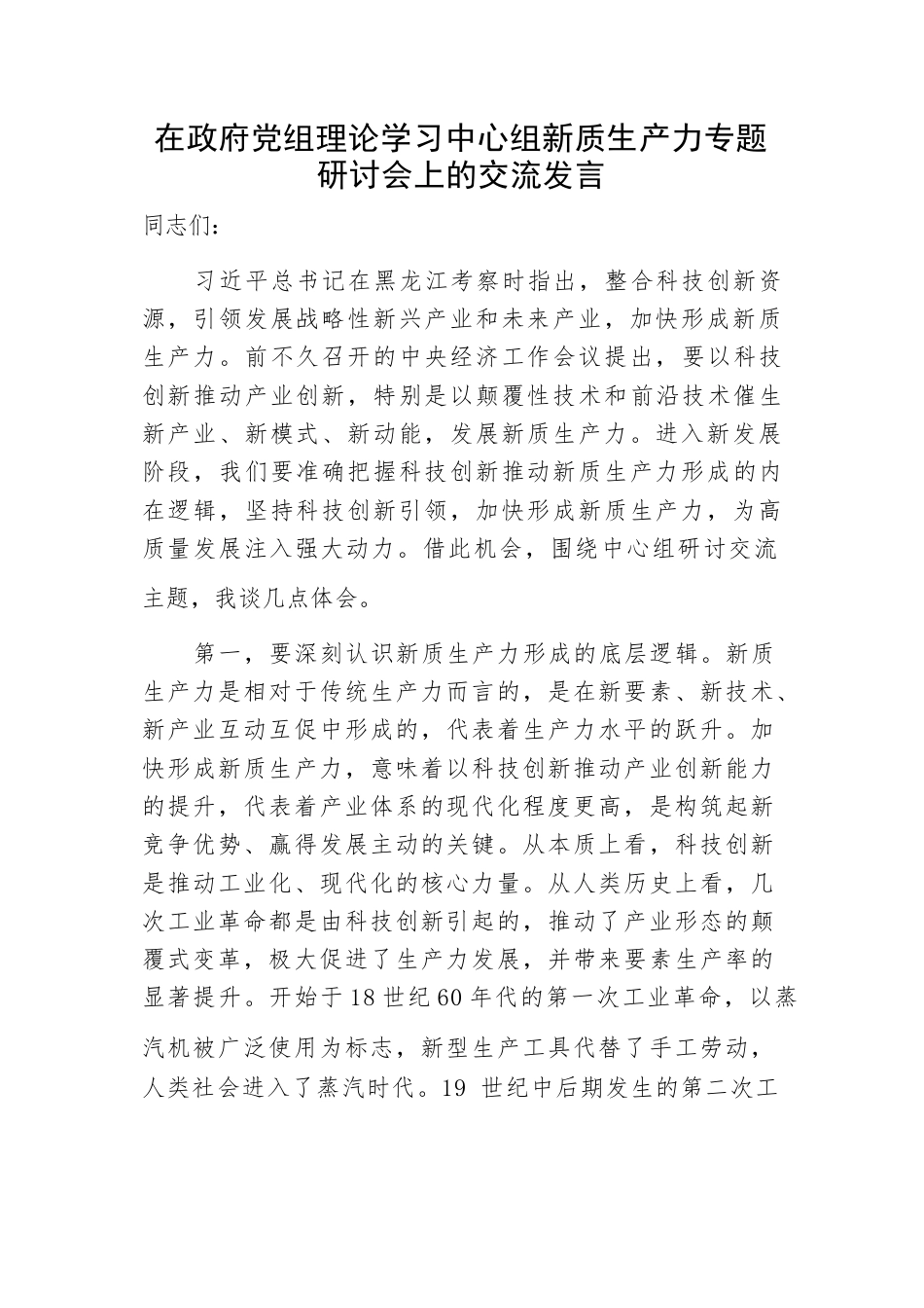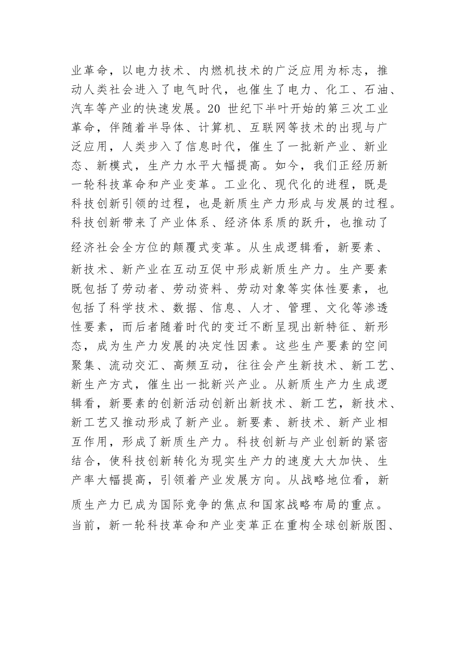 目錄在政府黨組理論學習中心組新質生產(chǎn)力專題研討會上的交流發(fā)言新質生產(chǎn)力的內涵特征和發(fā)展重點關于新質生產(chǎn)力的研討發(fā)言材料加快形成新質生產(chǎn)力事關中國式現(xiàn)代化全局推動新質生產(chǎn)力加快發(fā)展加快構建與新質生產(chǎn)力相適應的產(chǎn)業(yè)新體系在政府黨組理論學習中心組新質生產(chǎn)力專題研討會上的交流發(fā)言同志們:習近平總書記在黑龍江考察時指出,整合科技創(chuàng)新資源,引領發(fā)展戰(zhàn)略性新興產(chǎn)業(yè)和未來產(chǎn)業(yè),加快形成新質生產(chǎn)力。前不久召開的中央經(jīng)濟工作會議提出,要以科技創(chuàng)新推動產(chǎn)業(yè)創(chuàng)新,特別是以顛覆性技術和前沿技術催生新產(chǎn)業(yè)、新模式、新動能,發(fā)展新質生產(chǎn)力。進入新發(fā)展階段...