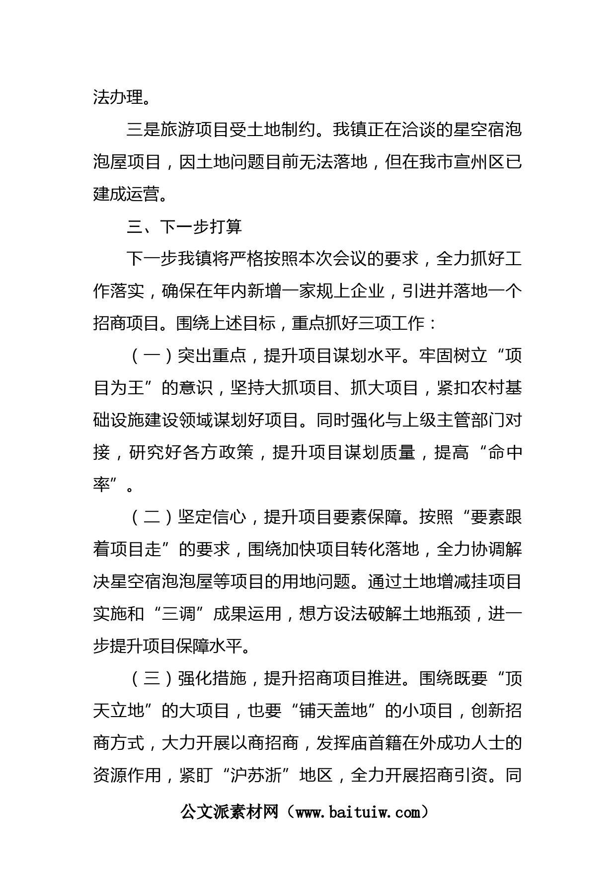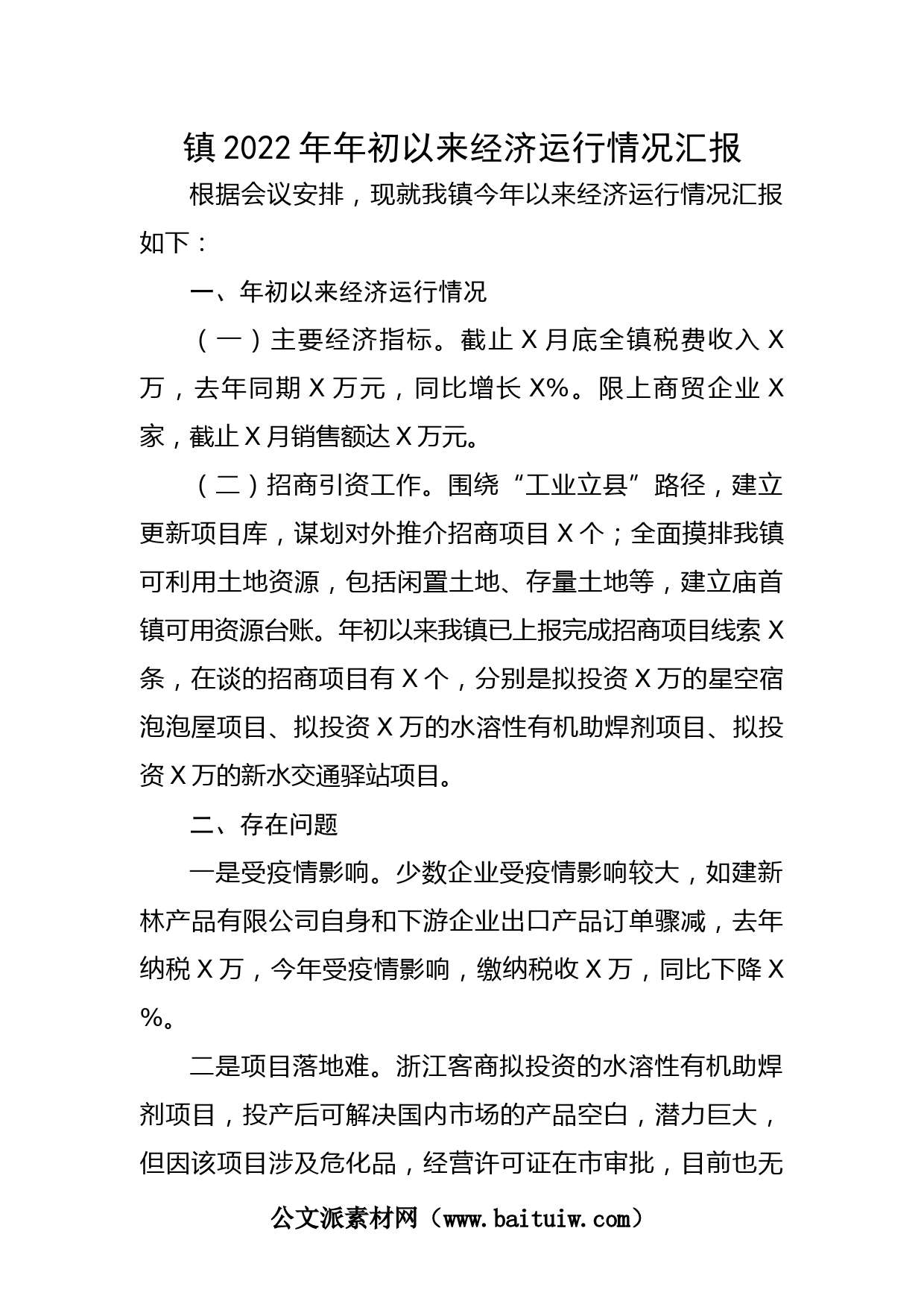 鎮(zhèn)2022年年初以來經(jīng)濟(jì)運(yùn)行情況匯報(bào)根據(jù)會(huì)議安排,現(xiàn)就我鎮(zhèn)今年以來經(jīng)濟(jì)運(yùn)行情況匯報(bào)如下:一、年初以來經(jīng)濟(jì)運(yùn)行情況(一)主要經(jīng)濟(jì)指標(biāo)。截止X月底全鎮(zhèn)稅費(fèi)收入X萬,去年同期X萬元,同比增長X%。限上商貿(mào)企業(yè)X家,截止X月銷售額達(dá)X萬元。(二)招商引資工作。圍繞“工業(yè)立縣”路徑,建立更新項(xiàng)目庫,謀劃對(duì)外推介招商項(xiàng)目X個(gè);全面摸排我鎮(zhèn)可利用土地資源,包括閑置土地、存量土地等,建立廟首鎮(zhèn)可用資源臺(tái)賬。年初以來我鎮(zhèn)已上報(bào)完成招商項(xiàng)目線索X條,在談的招商項(xiàng)目有X個(gè),分別是擬投資X萬的星空宿泡泡屋項(xiàng)目、擬投資X萬的水溶性有機(jī)助焊劑項(xiàng)目、擬投資X萬的新水交通驛...