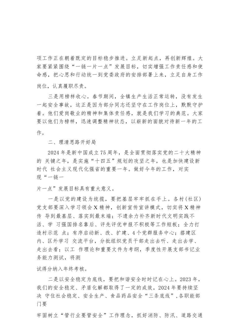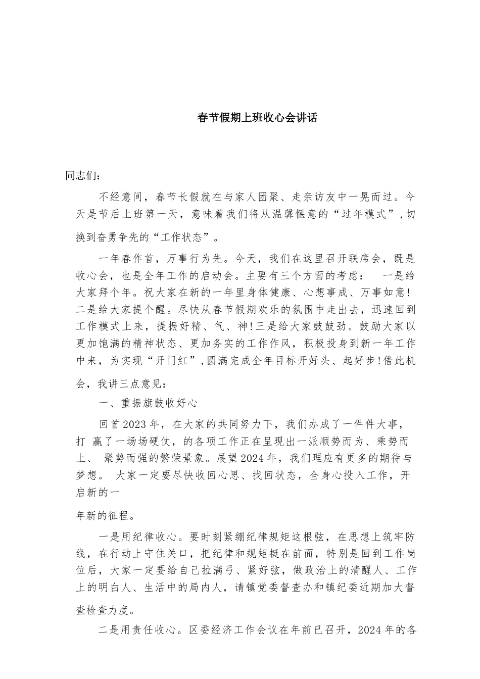 春節(jié)假期上班收心會(huì)講話同志們:不經(jīng)意間,春節(jié)長假就在與家人團(tuán)聚、走親訪友中一晃而過。今天是節(jié)后上班第一天,意味著我們將從溫馨愜意的“過年模式”,切換到奮勇爭(zhēng)先的“工作狀態(tài)”。一年春作首,萬事行為先。今天,我們?cè)谶@里召開聯(lián)席會(huì),既是收心會(huì),也是全年工作的啟動(dòng)會(huì)。主要有三個(gè)方面的考慮:一是給大家拜個(gè)年。祝大家在新的一年里身體健康、心想事成、萬事如意!二是給大家提個(gè)醒。盡快從春節(jié)假期歡樂的氛圍中走出去,迅速回到工作模式上來,提振好精、氣、神!三是給大家鼓鼓勁。鼓勵(lì)大家以更加飽滿的精神狀態(tài)、更加務(wù)實(shí)的工作作風(fēng),積極投身到新一年工作中來...