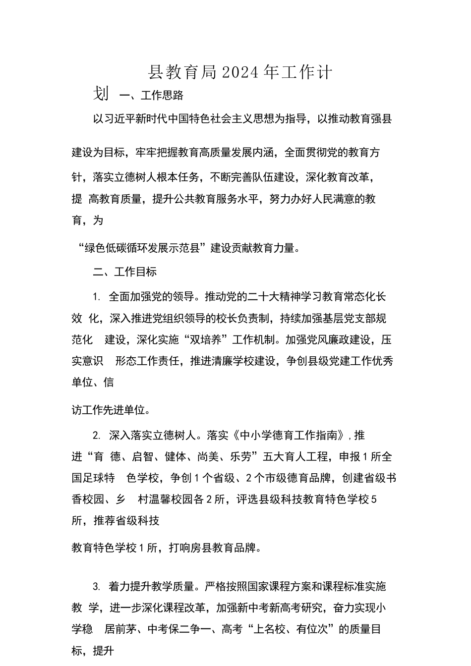 縣教育局2024年工作計(jì)劃一、工作思路以習(xí)近平新時(shí)代中國(guó)特色社會(huì)主義思想為指導(dǎo),以推動(dòng)教育強(qiáng)縣建設(shè)為目標(biāo),牢牢把握教育高質(zhì)量發(fā)展內(nèi)涵,全面貫徹黨的教育方針,落實(shí)立德樹(shù)人根本任務(wù),不斷完善隊(duì)伍建設(shè),深化教育改革,提高教育質(zhì)量,提升公共教育服務(wù)水平,努力辦好人民滿意的教育,為“綠色低碳循環(huán)發(fā)展示范縣”建設(shè)貢獻(xiàn)教育力量。二、工作目標(biāo)1.全面加強(qiáng)黨的領(lǐng)導(dǎo)。推動(dòng)黨的二十大精神學(xué)習(xí)教育常態(tài)化長(zhǎng)效化,深入推進(jìn)黨組織領(lǐng)導(dǎo)的校長(zhǎng)負(fù)責(zé)制,持續(xù)加強(qiáng)基層黨支部規(guī)范化建設(shè),深化實(shí)施“雙培養(yǎng)”工作機(jī)制。加強(qiáng)黨風(fēng)廉政建設(shè),壓實(shí)意識(shí)形態(tài)工作責(zé)任,推進(jìn)清廉學(xué)校建設(shè)...