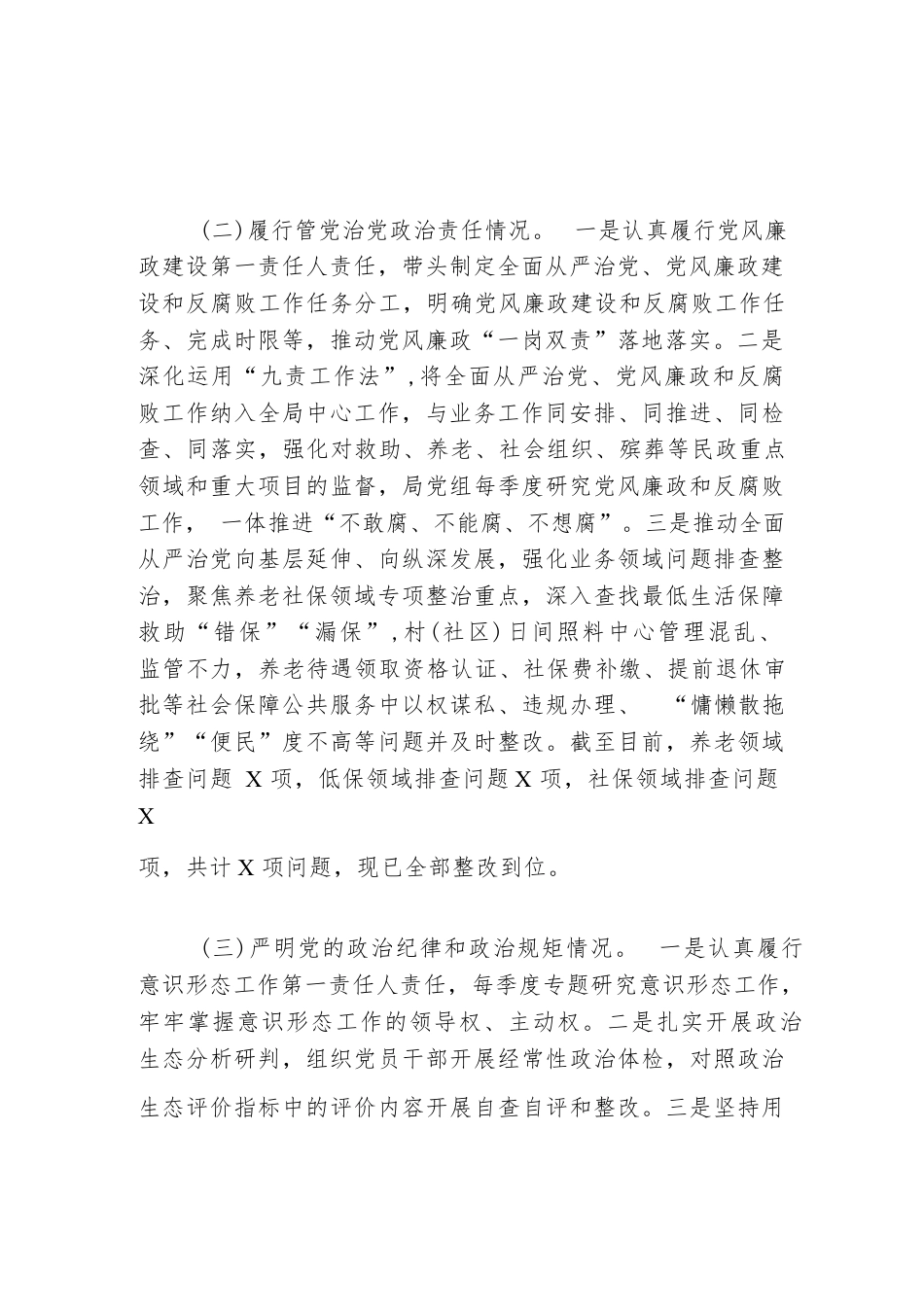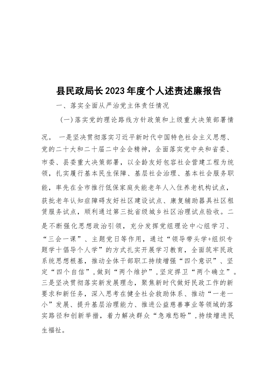 縣民政局長(zhǎng)2023年度個(gè)人述責(zé)述廉報(bào)告一、落實(shí)全面從嚴(yán)治黨主體責(zé)任情況(一)落實(shí)黨的理論路線方針政策和上級(jí)重大決策部署情況。一是堅(jiān)決貫徹落實(shí)習(xí)近平新時(shí)代中國(guó)特色社會(huì)主義思想、黨的二十大和二十屆二中全會(huì)精神,全面落實(shí)黨中央和省委、市委、縣委重大決策部署,以全齡友好包容社會(huì)營(yíng)建工程為統(tǒng)領(lǐng),扎實(shí)履行基本民生保障、基層社會(huì)治理、基本社會(huì)服務(wù)職能,率先在全市推行低保家庭失能老年人入住養(yǎng)老機(jī)構(gòu)試點(diǎn),獲批老年認(rèn)知癥障礙友好社區(qū)建設(shè)試點(diǎn)、康復(fù)輔助器具社區(qū)租賃服務(wù)試點(diǎn),順利通過(guò)第三批省級(jí)城鄉(xiāng)社區(qū)治理試點(diǎn)驗(yàn)收。二是不斷強(qiáng)化思想政治引領(lǐng),充分發(fā)揮黨組理...