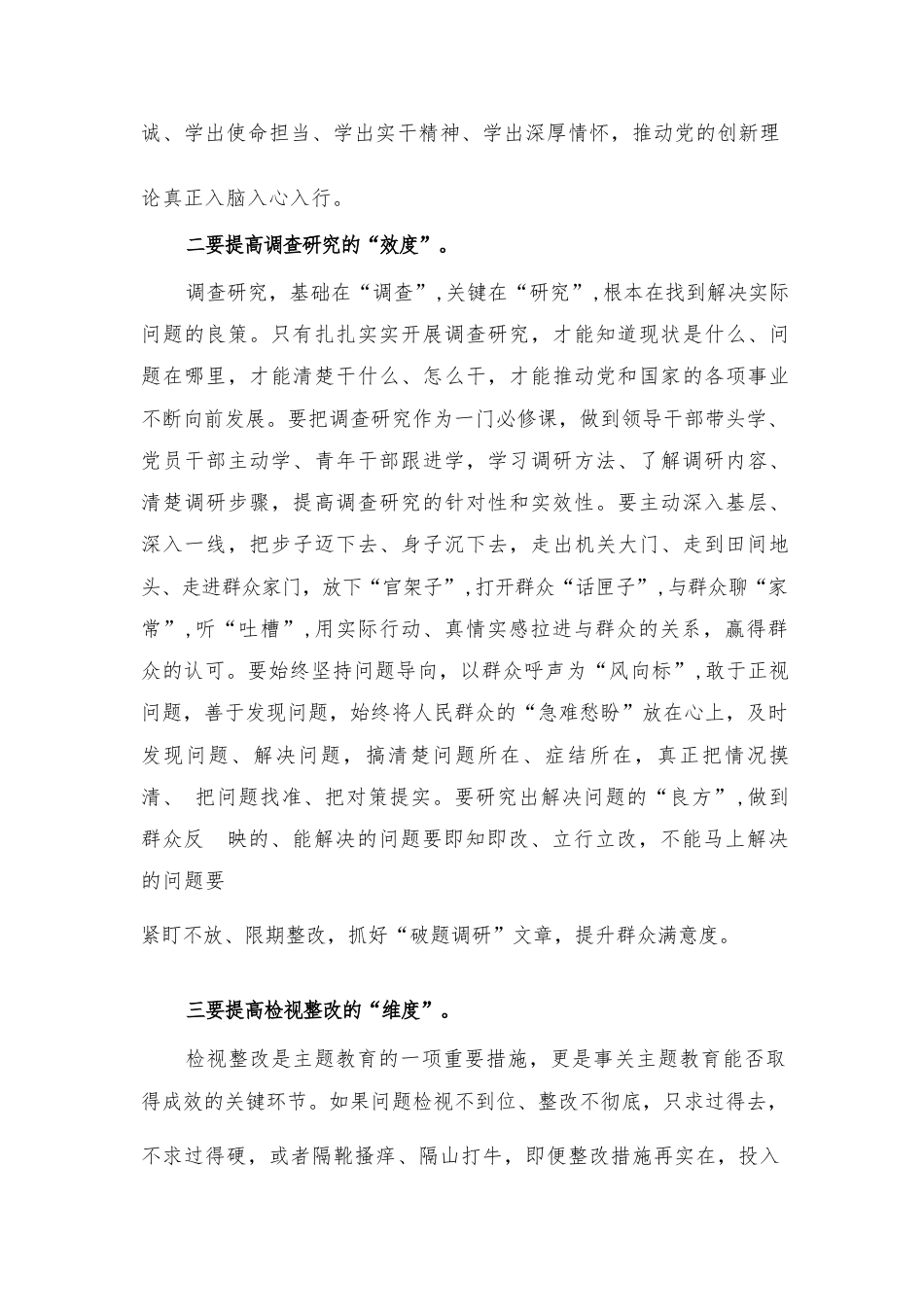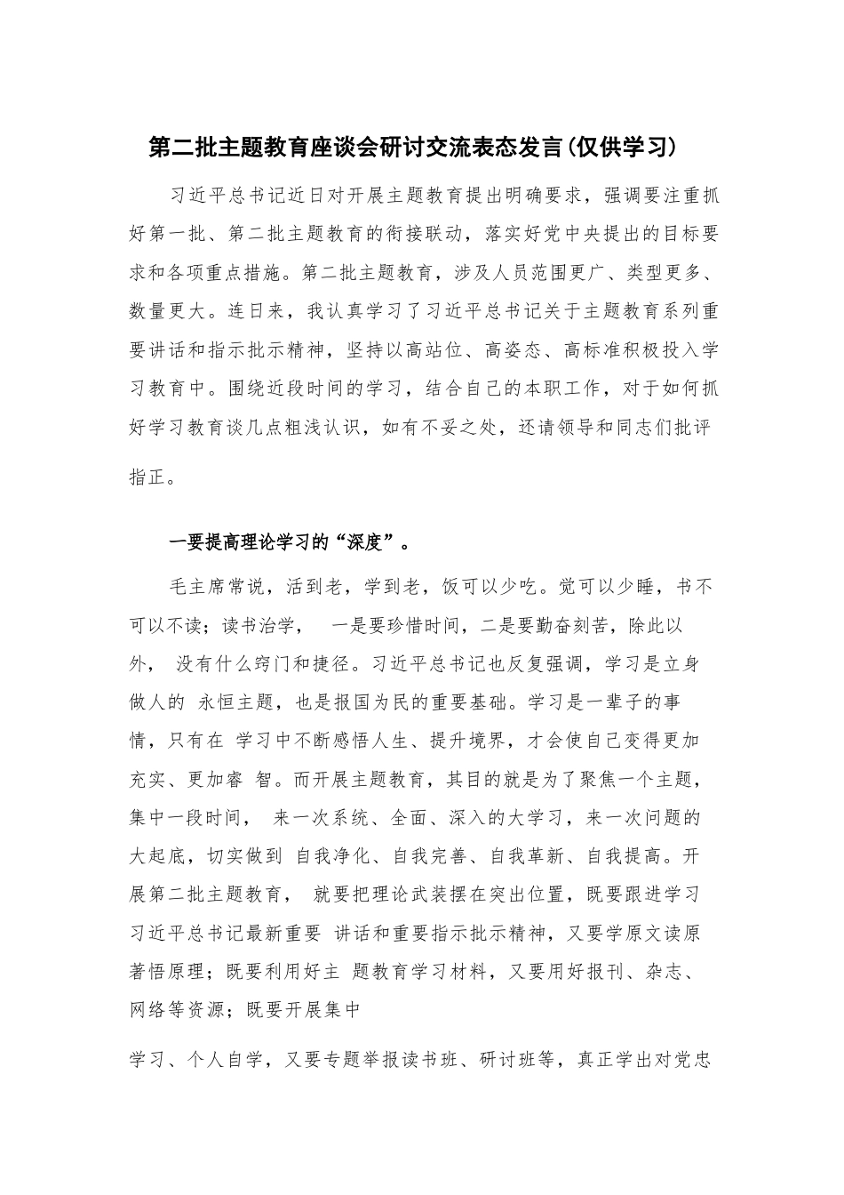 第二批主題教育座談會研討交流表態(tài)發(fā)言(僅供學習)習近平總書記近日對開展主題教育提出明確要求,強調(diào)要注重抓好第一批、第二批主題教育的銜接聯(lián)動,落實好黨中央提出的目標要求和各項重點措施。第二批主題教育,涉及人員范圍更廣、類型更多、數(shù)量更大。連日來,我認真學習了習近平總書記關(guān)于主題教育系列重要講話和指示批示精神,堅持以高站位、高姿態(tài)、高標準積極投入學習教育中。圍繞近段時間的學習,結(jié)合自己的本職工作,對于如何抓好學習教育談幾點粗淺認識,如有不妥之處,還請領(lǐng)導和同志們批評指正。一要提高理論學習的“深度”。毛主席常說,活到老,學到老,飯可...