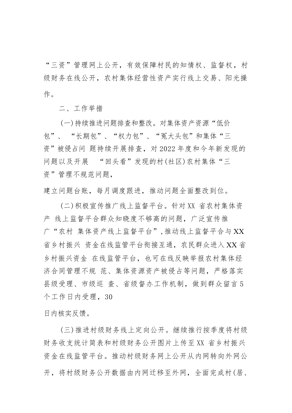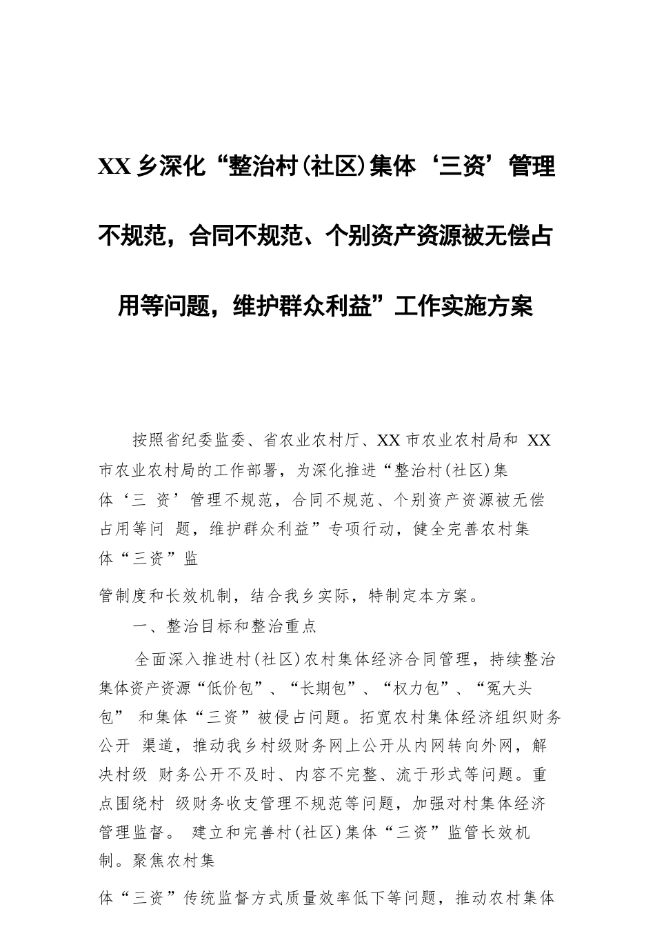 XX鄉(xiāng)深化“整治村(社區(qū))集體‘三資’管理不規(guī)范,合同不規(guī)范、個別資產(chǎn)資源被無償占用等問題,維護群眾利益”工作實施方案按照省紀(jì)委監(jiān)委、省農(nóng)業(yè)農(nóng)村廳、XX市農(nóng)業(yè)農(nóng)村局和XX市農(nóng)業(yè)農(nóng)村局的工作部署,為深化推進“整治村(社區(qū))集體‘三資’管理不規(guī)范,合同不規(guī)范、個別資產(chǎn)資源被無償占用等問題,維護群眾利益”專項行動,健全完善農(nóng)村集體“三資”監(jiān)管制度和長效機制,結(jié)合我鄉(xiāng)實際,特制定本方案。一、整治目標(biāo)和整治重點全面深入推進村(社區(qū))農(nóng)村集體經(jīng)濟合同管理,持續(xù)整治集體資產(chǎn)資源“低價包”、“長期包”、“權(quán)力包”、“冤大頭包”和集體“三資”被侵占問題。...