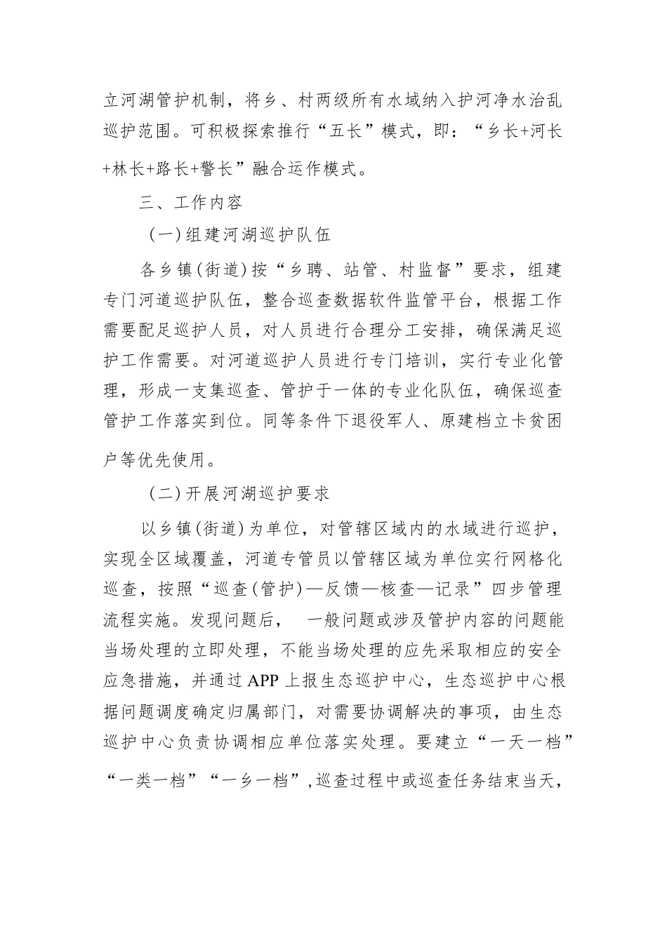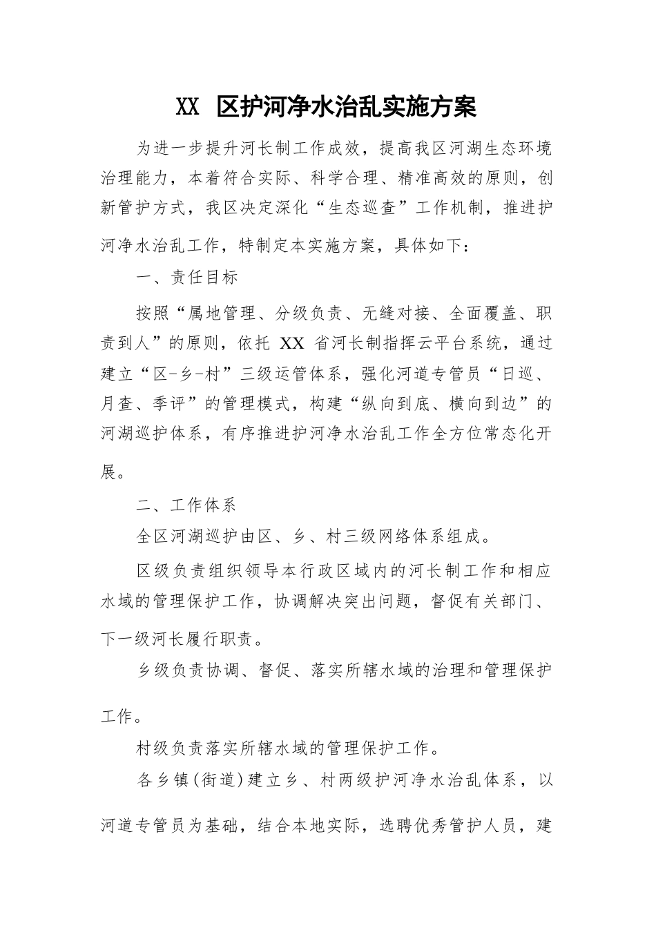 XX區(qū)護河凈水治亂實施方案為進一步提升河長制工作成效,提高我區(qū)河湖生態(tài)環(huán)境治理能力,本著符合實際、科學合理、精準高效的原則,創(chuàng)新管護方式,我區(qū)決定深化“生態(tài)巡查”工作機制,推進護河凈水治亂工作,特制定本實施方案,具體如下:一、責任目標按照“屬地管理、分級負責、無縫對接、全面覆蓋、職責到人”的原則,依托XX省河長制指揮云平臺系統(tǒng),通過建立“區(qū)-鄉(xiāng)-村”三級運管體系,強化河道專管員“日巡、月查、季評”的管理模式,構建“縱向到底、橫向到邊”的河湖巡護體系,有序推進護河凈水治亂工作全方位常態(tài)化開展。二、工作體系全區(qū)河湖巡護由區(qū)、鄉(xiāng)、村三級...