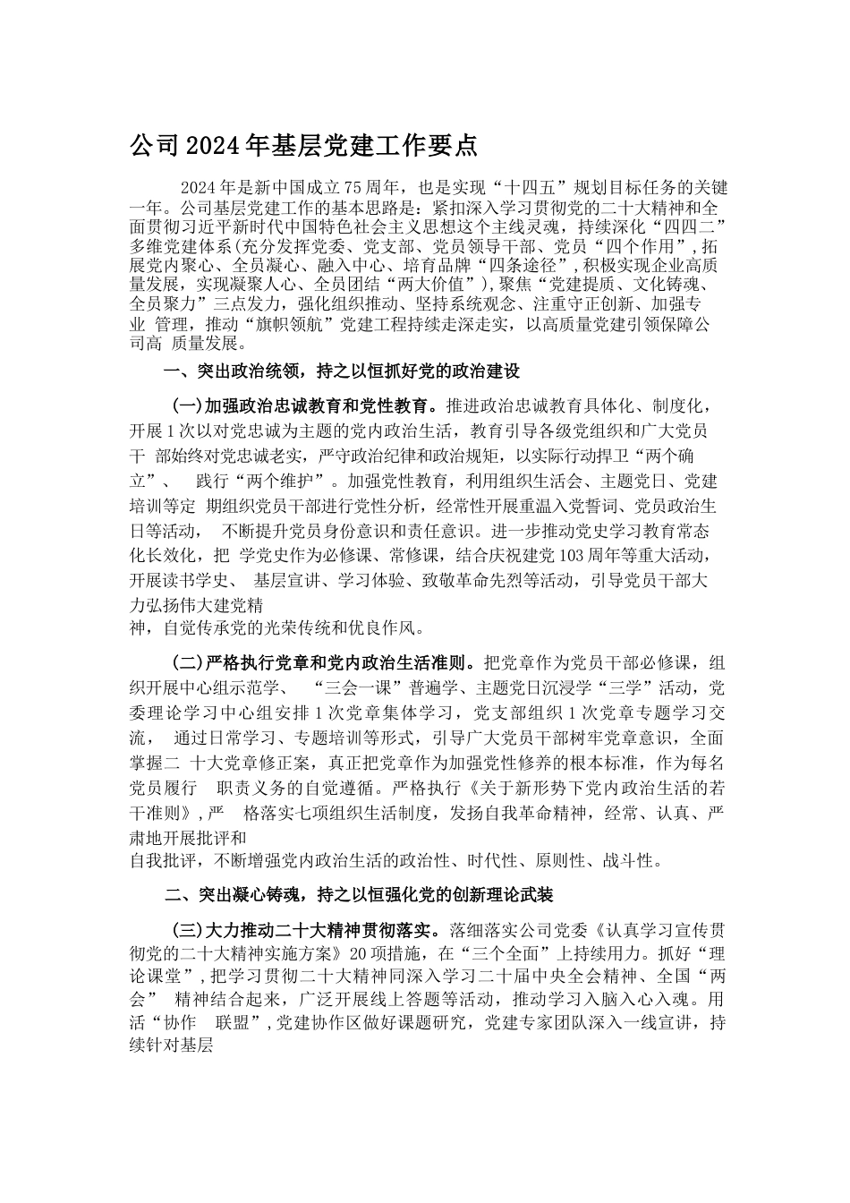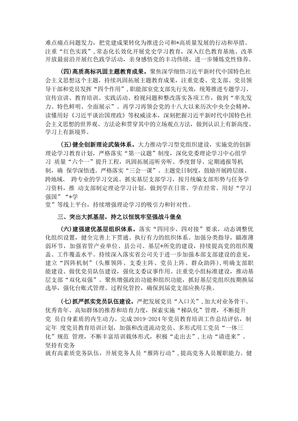 公司2024年基層黨建工作要點2024年是新中國成立75周年,也是實現(xiàn)“十四五”規(guī)劃目標任務(wù)的關(guān)鍵一年。公司基層黨建工作的基本思路是:緊扣深入學(xué)習(xí)貫徹黨的二十大精神和全面貫徹習(xí)近平新時代中國特色社會主義思想這個主線靈魂,持續(xù)深化“四四二”多維黨建體系(充分發(fā)揮黨委、黨支部、黨員領(lǐng)導(dǎo)干部、黨員“四個作用”,拓展黨內(nèi)聚心、全員凝心、融入中心、培育品牌“四條途徑”,積極實現(xiàn)企業(yè)高質(zhì)量發(fā)展,實現(xiàn)凝聚人心、全員團結(jié)“兩大價值”),聚焦“黨建提質(zhì)、文化鑄魂、全員聚力”三點發(fā)力,強化組織推動、堅持系統(tǒng)觀念、注重守正創(chuàng)新、加強專業(yè)管理,推動“旗幟領(lǐng)航”黨...