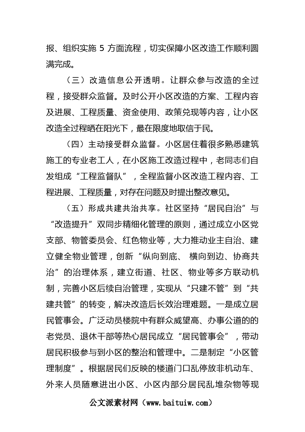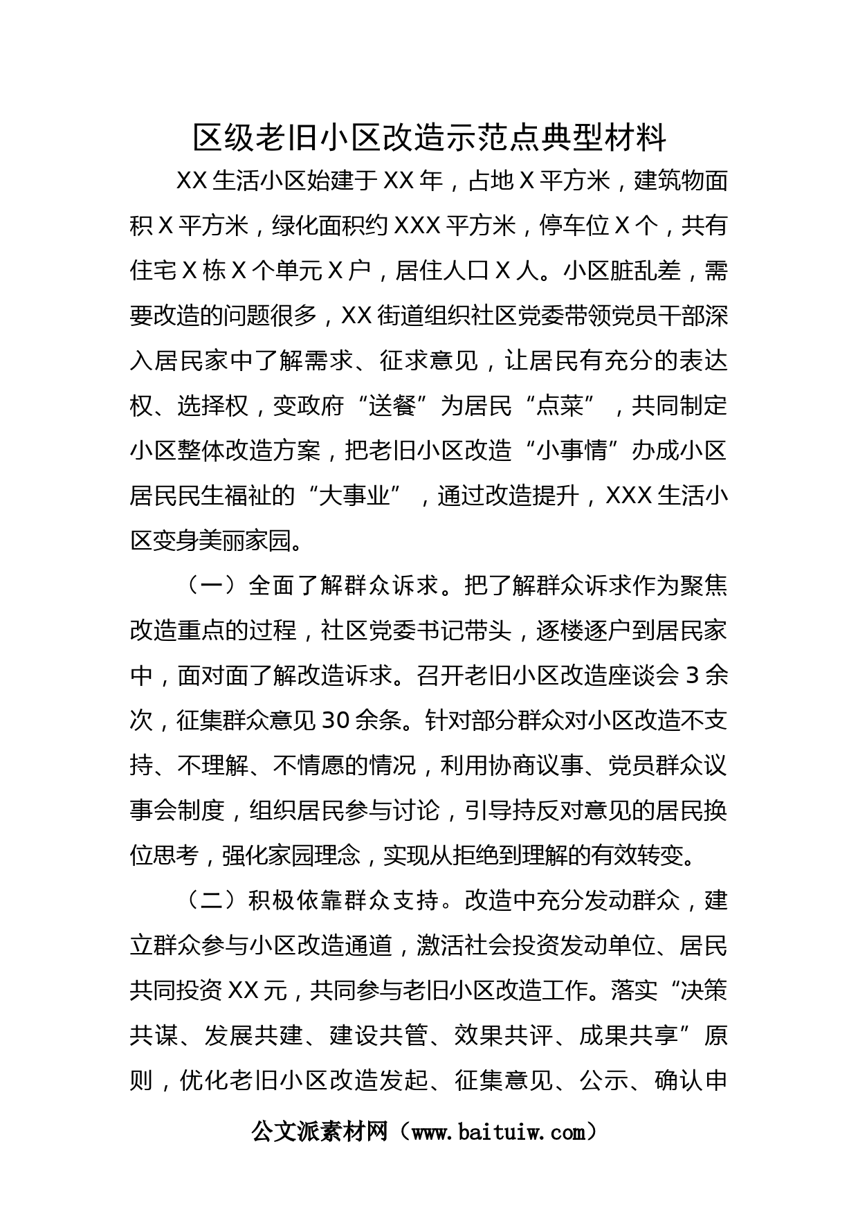 區(qū)級老舊小區(qū)改造示范點典型材料XX生活小區(qū)始建于XX年,占地X平方米,建筑物面積X平方米,綠化面積約XXX平方米,停車位X個,共有住宅X棟X個單元X戶,居住人口X人。小區(qū)臟亂差,需要改造的問題很多,XX街道組織社區(qū)黨委帶領(lǐng)黨員干部深入居民家中了解需求、征求意見,讓居民有充分的表達權(quán)、選擇權(quán),變政府“送餐”為居民“點菜”,共同制定小區(qū)整體改造方案,把老舊小區(qū)改造“小事情”辦成小區(qū)居民民生福祉的“大事業(yè)”,通過改造提升,XXX生活小區(qū)變身美麗家園。(一)全面了解群眾訴求。把了解群眾訴求作為聚焦改造重點的過程,社區(qū)黨委書記帶頭,逐樓逐戶到居民家中,...