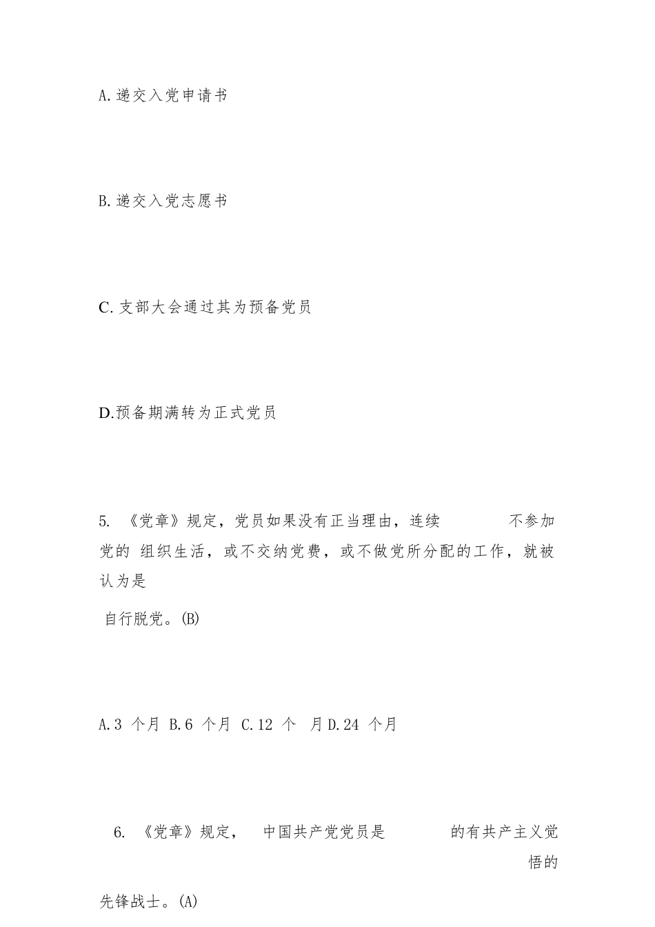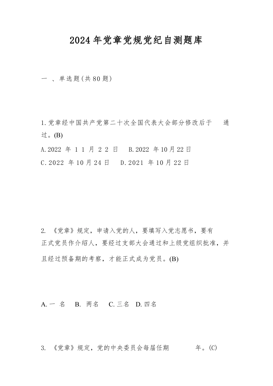 2024年黨章黨規(guī)黨紀(jì)自測(cè)題庫一、單選題(共80題)1.黨章經(jīng)中國共產(chǎn)黨第二十次全國代表大會(huì)部分修改后于通過。(B)A.2022年11月22日B.2022年10月22日C.2022年10月24日D.2021年10月22日2.《黨章》規(guī)定,申請(qǐng)入黨的人,要填寫入黨志愿書,要有正式黨員作介紹人,要經(jīng)過支部大會(huì)通過和上級(jí)黨組織批準(zhǔn),并且經(jīng)過預(yù)備期的考察,才能正式成為黨員。(B)A.一名B.兩名C.三名D.四名3.《黨章》規(guī)定,黨的中央委員會(huì)每屆任期年。(C)A.三B.四C.五D.六4.《黨章》規(guī)定,黨員的黨齡,從之日算起。(D)A.遞交入黨申請(qǐng)書B.遞交入黨志愿書C.支部大會(huì)通過其為預(yù)備黨員D.預(yù)備期滿轉(zhuǎn)為正式黨員5.《黨...