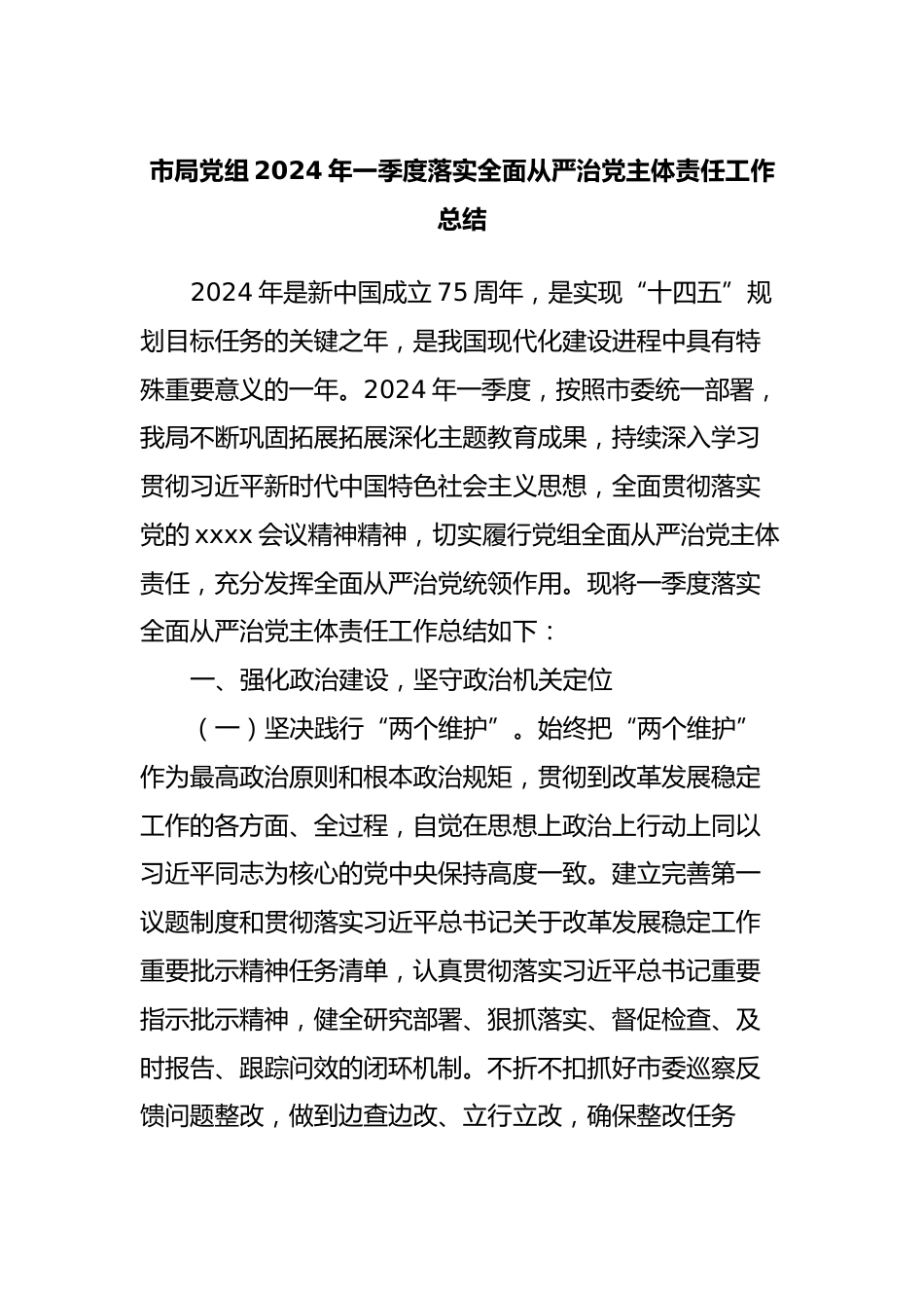 市局黨組2024年一季度落實全面從嚴(yán)治黨主體責(zé)任工作總結(jié)2024年是新中國成立75周年,是實現(xiàn)“十四五”規(guī)劃目標(biāo)任務(wù)的關(guān)鍵之年,是我國現(xiàn)代化建設(shè)進(jìn)程中具有特殊重要意義的一年。2024年一季度,按照市委統(tǒng)一部署,我局不斷鞏固拓展拓展深化主題教育成果,持續(xù)深入學(xué)習(xí)貫徹習(xí)近平新時代中國特色社會主義思想,全面貫徹落實黨的xxxx會議精神精神,切實履行黨組全面從嚴(yán)治黨主體責(zé)任,充分發(fā)揮全面從嚴(yán)治黨統(tǒng)領(lǐng)作用?,F(xiàn)將一季度落實全面從嚴(yán)治黨主體責(zé)任工作總結(jié)如下:一、強(qiáng)化政治建設(shè),堅守政治機(jī)關(guān)定位(一)堅決踐行“兩個維護(hù)”。始終把“兩個維護(hù)”作為最高政治原則和根...