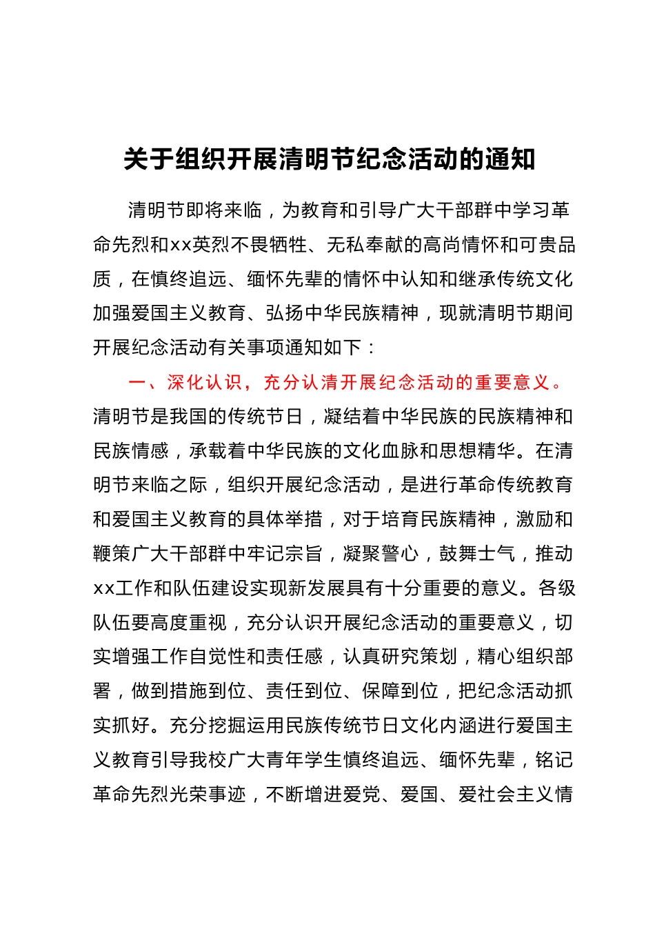 關(guān)于組織開展清明節(jié)紀(jì)念活動(dòng)的通知清明節(jié)即將來臨,為教育和引導(dǎo)廣大干部群中學(xué)習(xí)革命先烈和xx英烈不畏犧牲、無私奉獻(xiàn)的高尚情懷和可貴品質(zhì),在慎終追遠(yuǎn)、緬懷先輩的情懷中認(rèn)知和繼承傳統(tǒng)文化加強(qiáng)愛國(guó)主義教育、弘揚(yáng)中華民族精神,現(xiàn)就清明節(jié)期間開展紀(jì)念活動(dòng)有關(guān)事項(xiàng)通知如下:一、深化認(rèn)識(shí),充分認(rèn)清開展紀(jì)念活動(dòng)的重要意義。清明節(jié)是我國(guó)的傳統(tǒng)節(jié)日,凝結(jié)著中華民族的民族精神和民族情感,承載著中華民族的文化血脈和思想精華。在清明節(jié)來臨之際,組織開展紀(jì)念活動(dòng),是進(jìn)行革命傳統(tǒng)教育和愛國(guó)主義教育的具體舉措,對(duì)于培育民族精神,激勵(lì)和鞭策廣大干部群中牢記宗旨,...