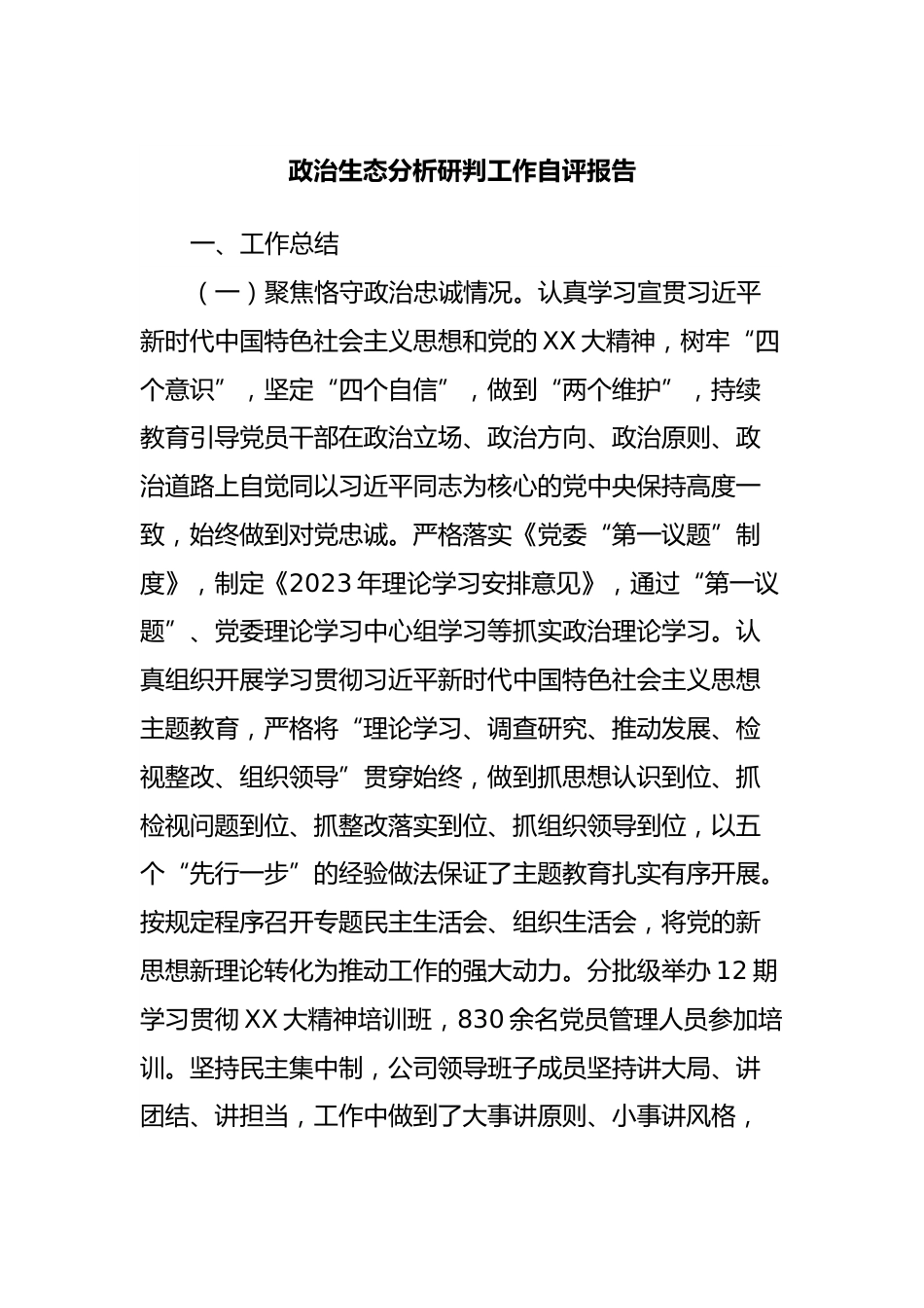 政治生態(tài)分析研判工作自評報告一、工作總結(jié)(一)聚焦恪守政治忠誠情況。認真學(xué)習(xí)宣貫習(xí)近平新時代中國特色社會主義思想和黨的XX大精神,樹牢“四個意識”,堅定“四個自信”,做到“兩個維護”,持續(xù)教育引導(dǎo)黨員干部在政治立場、政治方向、政治原則、政治道路上自覺同以習(xí)近平同志為核心的黨中央保持高度一致,始終做到對黨忠誠。嚴格落實《黨委“第一議題”制度》,制定《2023年理論學(xué)習(xí)安排意見》,通過“第一議題”、黨委理論學(xué)習(xí)中心組學(xué)習(xí)等抓實政治理論學(xué)習(xí)。認真組織開展學(xué)習(xí)貫徹習(xí)近平新時代中國特色社會主義思想主題教育,嚴格將“理論學(xué)習(xí)、調(diào)查研究、推動發(fā)...