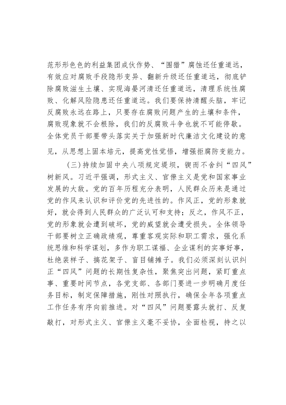 某某公司黨委書記在黨風(fēng)廉政建設(shè)會(huì)議上的講話這次會(huì)議的主要任務(wù)是。以習(xí)近平新時(shí)代中國特色社會(huì)主義思想為指導(dǎo),全面貫徹黨的二十精神,扎實(shí)落實(shí)上級(jí)公司黨風(fēng)廉政建設(shè)和反腐敗工作會(huì)議要求,總結(jié)分析我廠全面從嚴(yán)治黨形勢任務(wù),安排今后一個(gè)時(shí)期的重點(diǎn)工作,堅(jiān)定不移推進(jìn)全面從嚴(yán)治黨向縱深發(fā)展,強(qiáng)化引領(lǐng)保障,為全面完成年度各項(xiàng)目標(biāo)任務(wù)提供堅(jiān)強(qiáng)政治保障。下面,我代表廠黨委,講三個(gè)方面的意見。一、深入學(xué)習(xí)貫徹黨的二十大精神,進(jìn)一步統(tǒng)一思想,提高站位。(一)鞏固主題教育成果,更加堅(jiān)定自覺地牢記初心使命、開創(chuàng)發(fā)展新局。我們要提高運(yùn)用理論知識(shí)解決實(shí)際問題的...