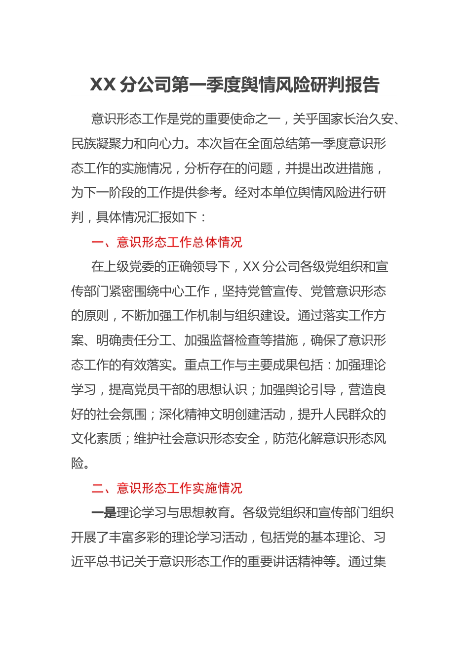 XX分公司第一季度輿情風險研判報告意識形態(tài)工作是黨的重要使命之一,關乎國家長治久安、民族凝聚力和向心力。本次旨在全面總結第一季度意識形態(tài)工作的實施情況,分析存在的問題,并提出改進措施,為下一階段的工作提供參考。經對本單位輿情風險進行研判,具體情況匯報如下:一、意識形態(tài)工作總體情況在上級黨委的正確領導下,XX分公司各級黨組織和宣傳部門緊密圍繞中心工作,堅持黨管宣傳、黨管意識形態(tài)的原則,不斷加強工作機制與組織建設。通過落實工作方案、明確責任分工、加強監(jiān)督檢查等措施,確保了意識形態(tài)工作的有效落實。重點工作與主要成果包括:加強理論學習,...