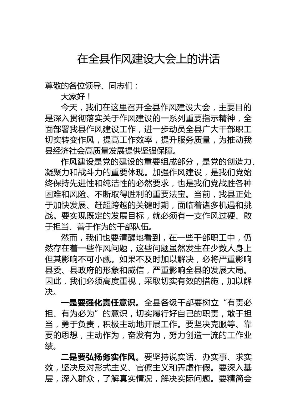 在全縣作風(fēng)建設(shè)大會(huì)上的講話尊敬的各位領(lǐng)導(dǎo)、同志們:大家好!今天,我們?cè)谶@里召開全縣作風(fēng)建設(shè)大會(huì),主要目的是深入貫徹落實(shí)關(guān)于作風(fēng)建設(shè)的一系列重要指示精神,全面部署我縣作風(fēng)建設(shè)工作,進(jìn)一步動(dòng)員全縣廣大干部職工切實(shí)轉(zhuǎn)變作風(fēng),提高工作效率,提升服務(wù)質(zhì)量,為推動(dòng)我縣經(jīng)濟(jì)社會(huì)高質(zhì)量發(fā)展提供堅(jiān)強(qiáng)保障。作風(fēng)建設(shè)是黨的建設(shè)的重要組成部分,是黨的創(chuàng)造力、凝聚力和戰(zhàn)斗力的重要體現(xiàn)。加強(qiáng)作風(fēng)建設(shè),是我們黨始終保持先進(jìn)性和純潔性的必然要求,也是我們黨戰(zhàn)勝各種困難和風(fēng)險(xiǎn)、不斷取得勝利的重要法寶。當(dāng)前,我縣正處于加快發(fā)展、趕超跨越的關(guān)鍵時(shí)期,面臨著諸多機(jī)...
