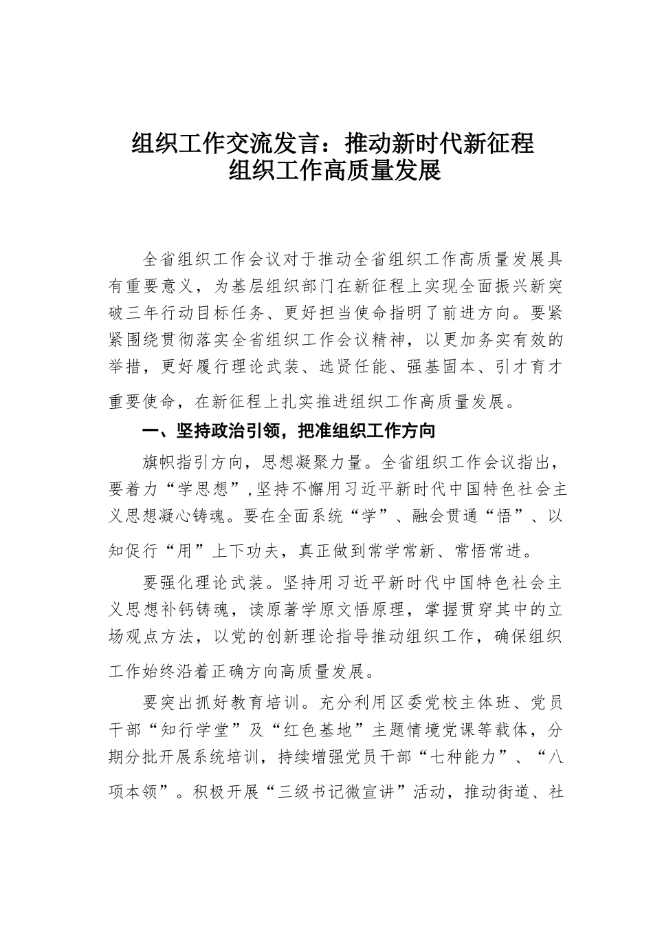 組織工作交流發(fā)言:推動新時代新征程組織工作高質(zhì)量發(fā)展VIP免費