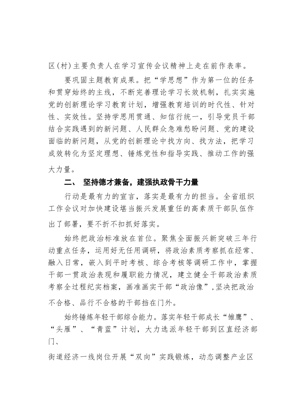 組織工作交流發(fā)言:推動新時代新征程組織工作高質(zhì)量發(fā)展全省組織工作會議對于推動全省組織工作高質(zhì)量發(fā)展具有重要意義,為基層組織部門在新征程上實現(xiàn)全面振興新突破三年行動目標任務、更好擔當使命指明了前進方向。要緊緊圍繞貫徹落實全省組織工作會議精神,以更加務實有效的舉措,更好履行理論武裝、選賢任能、強基固本、引才育才重要使命,在新征程上扎實推進組織工作高質(zhì)量發(fā)展。一、堅持政治引領,把準組織工作方向旗幟指引方向,思想凝聚力量。全省組織工作會議指出,要著力“學思想”,堅持不懈用習近平新時代中國特色社會主義思想凝心鑄魂。要在全面系統(tǒng)“學”、...